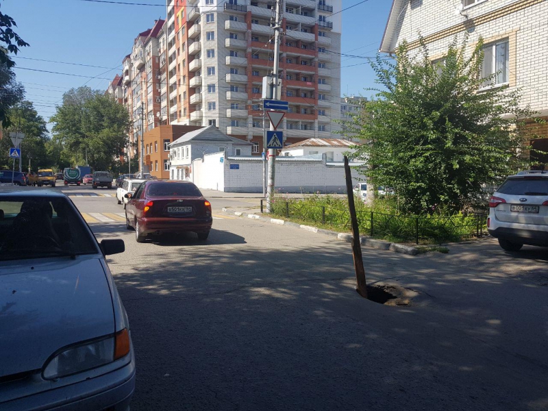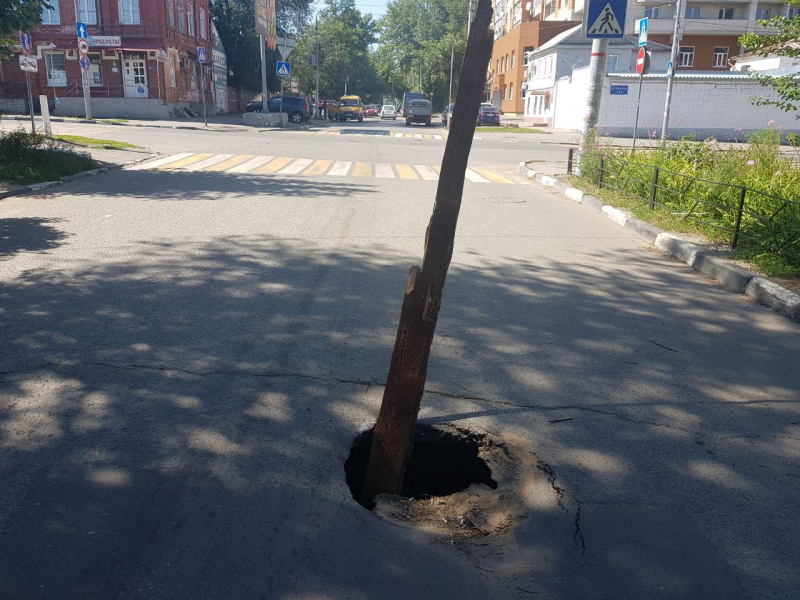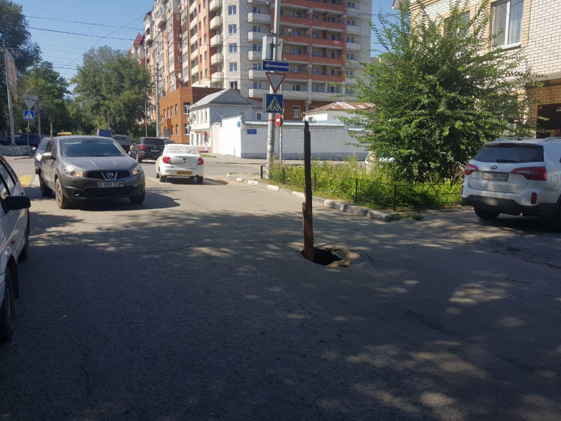 На улице Зарубина, в центре Саратова, образовался очередной провал. Яму, находящуюся по центру проезжей части, обозначили бревном.