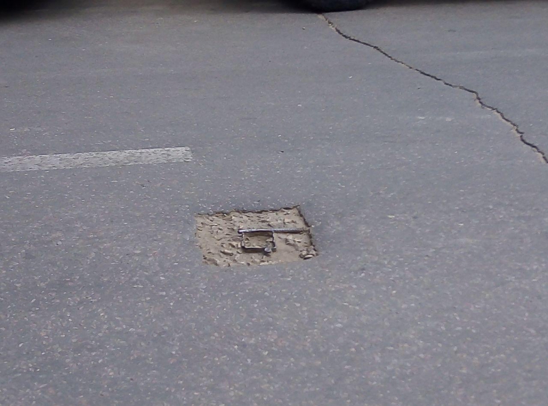 Отдельно стоит отметить торчащие на дороге остатки металлической арматуры, о которую могут пробить колеса автолюбители, два таких участка расположилось почти по центру проезжей части напротив дома №33/35.