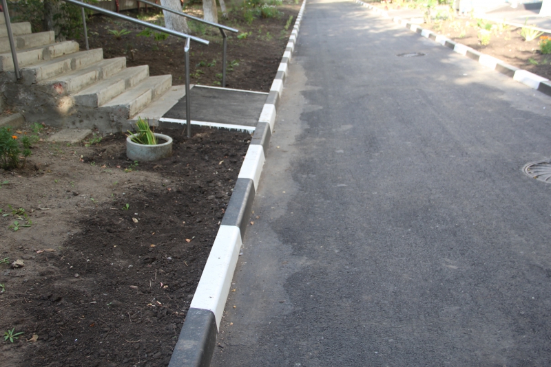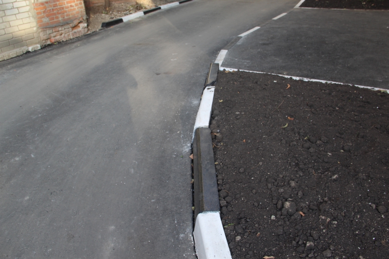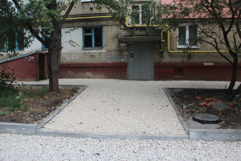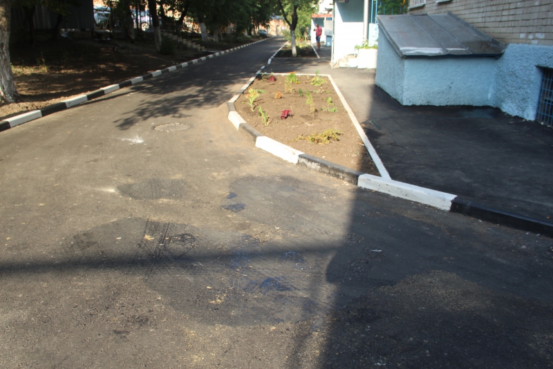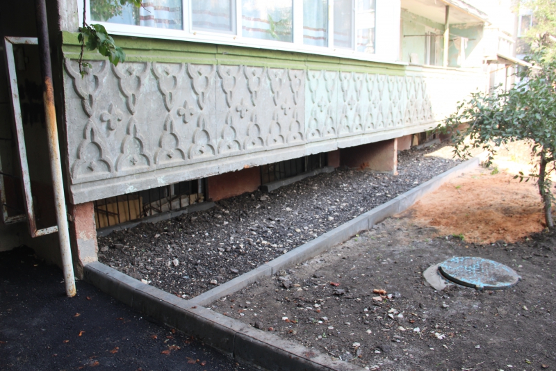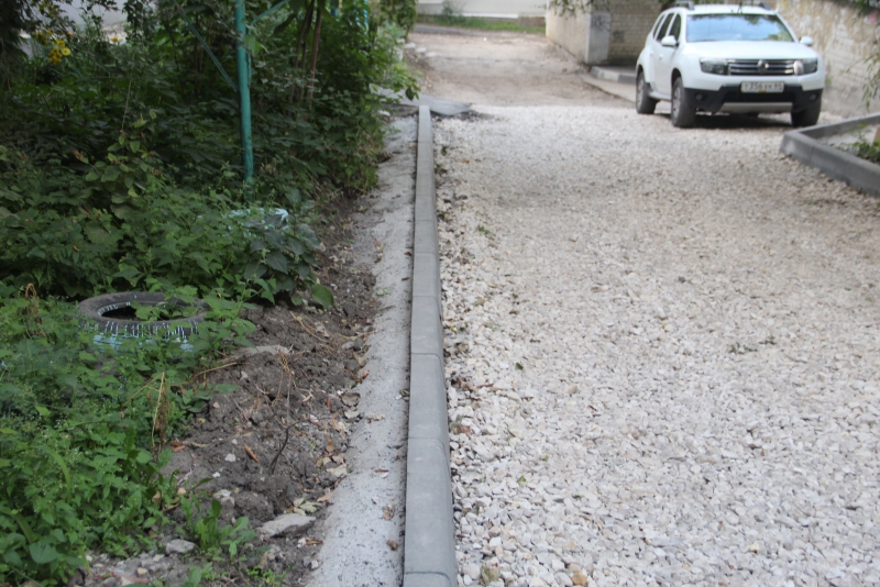 Неблагоустроенным выглядит двор в поселке Жасминный на улице Строителей. У дома №14 отмостку отсыпали асфальтной крошкой, при этом установив новые бортовые камни. Судя по схеме ремонта, размещенной на территории двора, данные работы не были предусмотрены контрактом. Но подобное исполнение работ, мягко говоря, выглядит спорно. У входа в подвал дома бортовые камни не запилены и выступают на проезд.