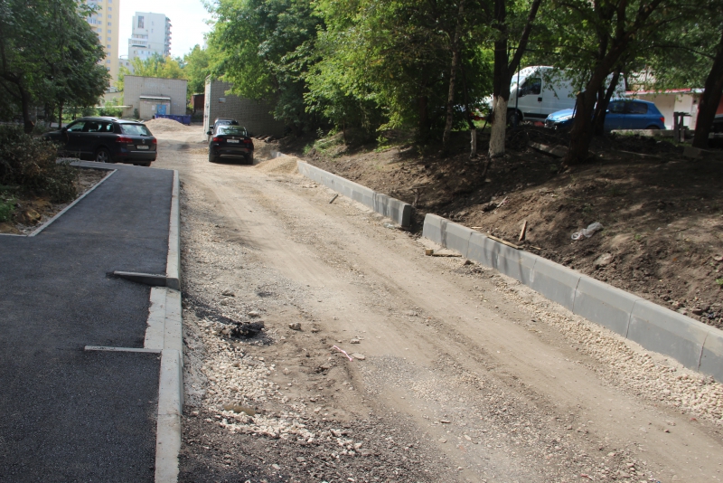 Незапиленными и незаниженными оказались примыкающие к входным группам бортовые камни у дома №2 по 1-му Соколовогорскому проезду. В этом дворе работы еще не закончены и, возможно, все исправят перед покраской бордюра.
