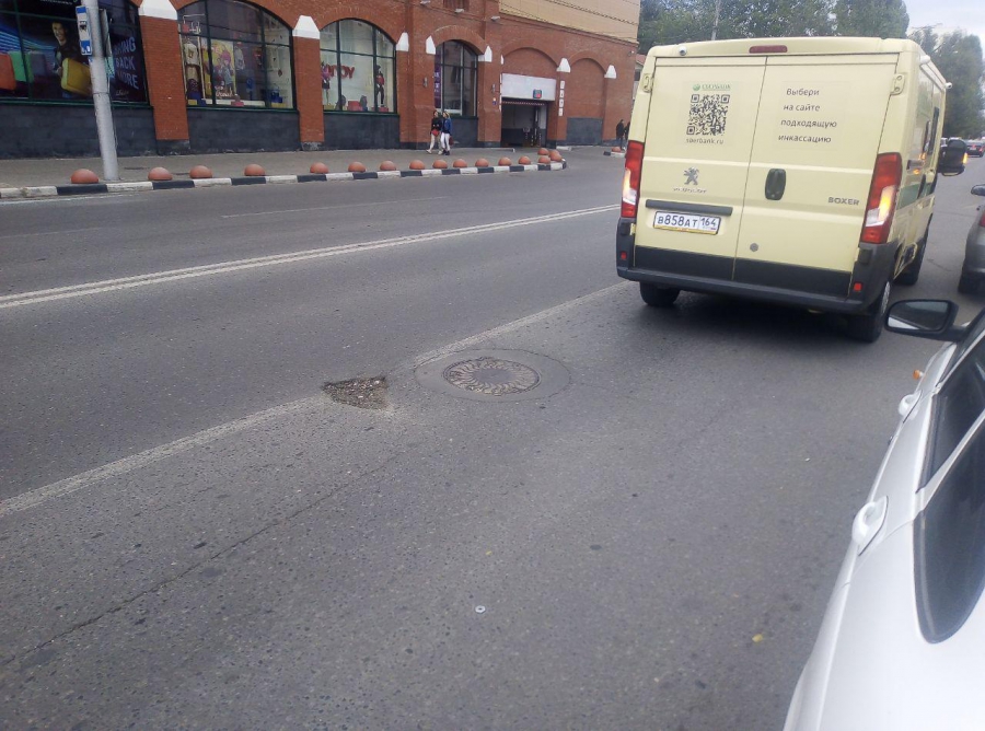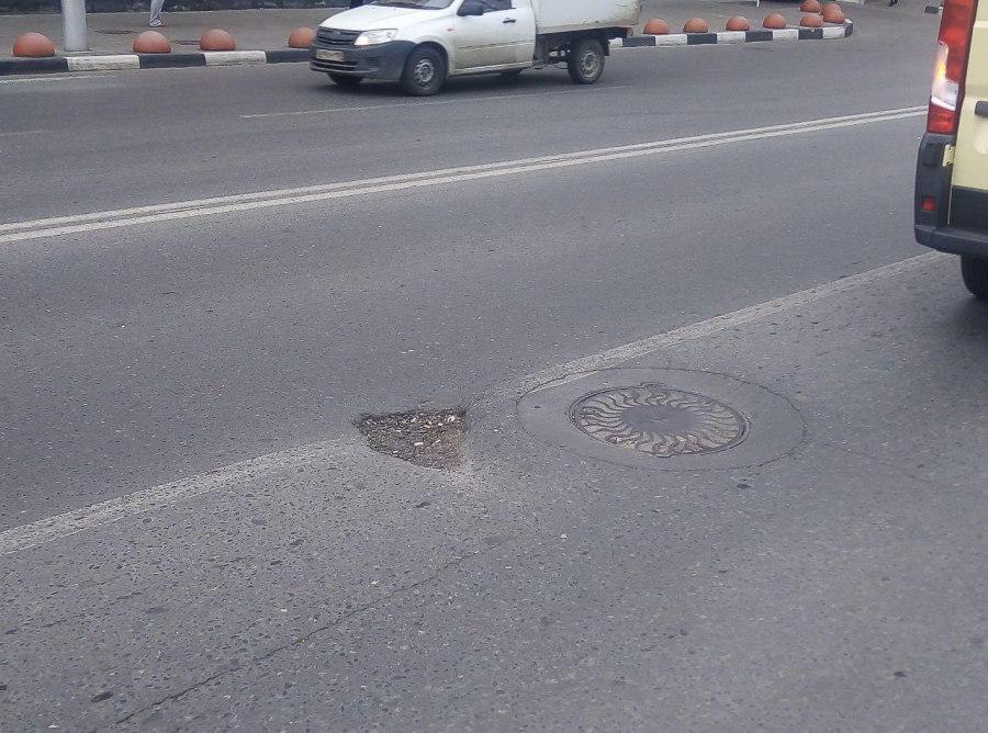 Просадка, появившаяся в середине лета на улице Кутякова, рядом с пересечением с улицей Астраханской, продолжает мешать движению транспортных средств в направлении улицы Рахова.