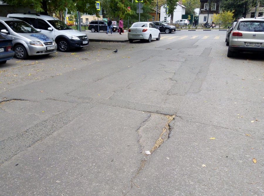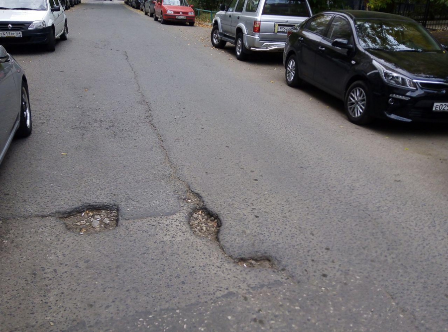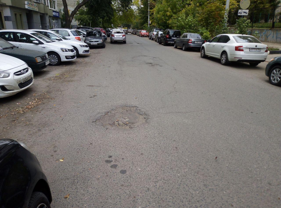 Выбоина заняла центр проезжей части напротив дома №7, при этом обилие припаркованного транспорта не позволяет водителям объехать препятствие.