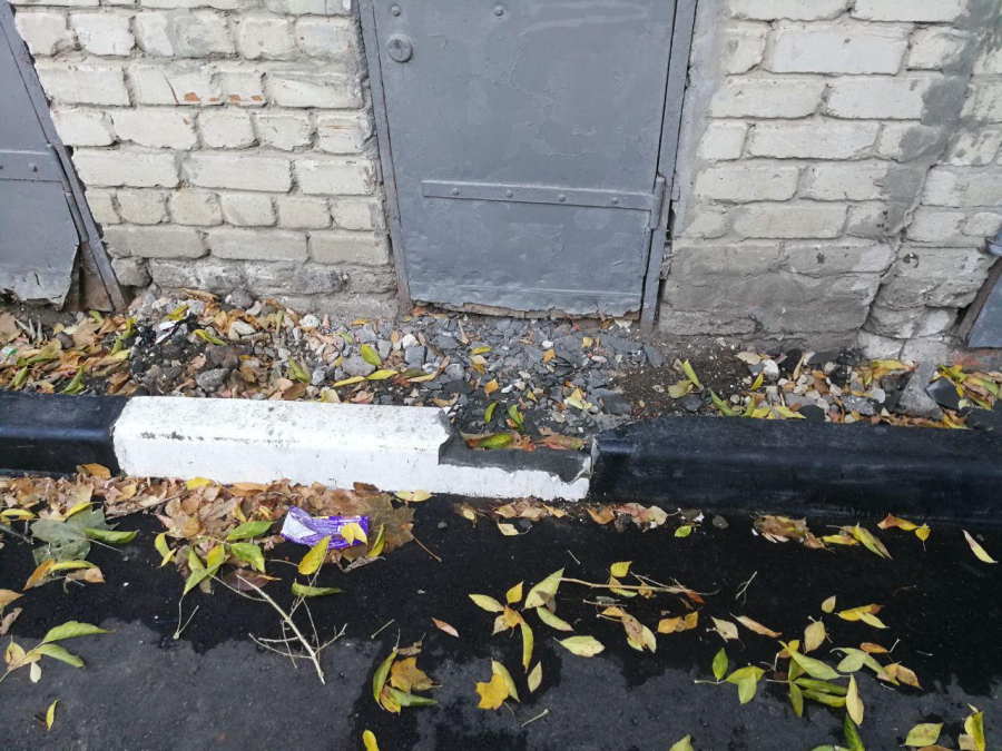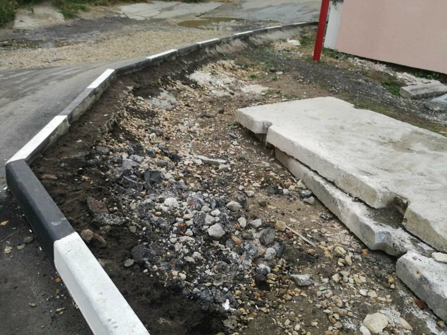 Во дворе Рябиновской, 4 по аналогичному сценарию установили бетонный лестничный марш к погребам. Его просто кинули на наклонную поверхность, от чего он уже покосился. Установщики не удосужились даже заделать большой зазор между бордюром и ступенькой, а также вывести строительный мусор после монтажа.