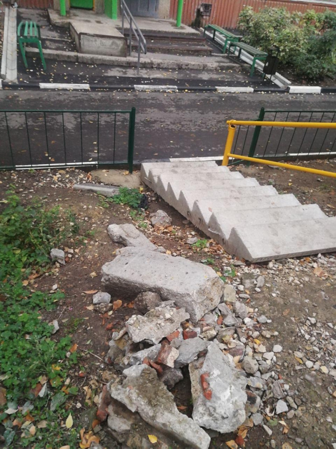 И частично обещание исполнилось. Указанные работы не вошли в контракт по ремонту дворов, тем не менее, лестница была отремонтирована, ну а про поручень просто забыли.