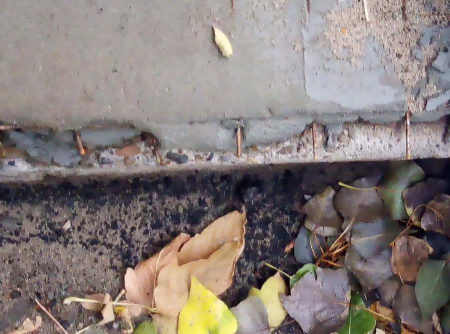 Лестница в отремонтированном виде простояла совсем не долго. Цемент, которым ее латали, начал ломаться, истираться и обнажать арматурную сетку. На нижней ступени отвалился приваренный металлический уголок, и арматура буквально оскалила свои штыри, поджидая невнимательную жертву.
