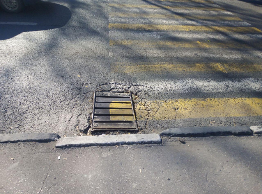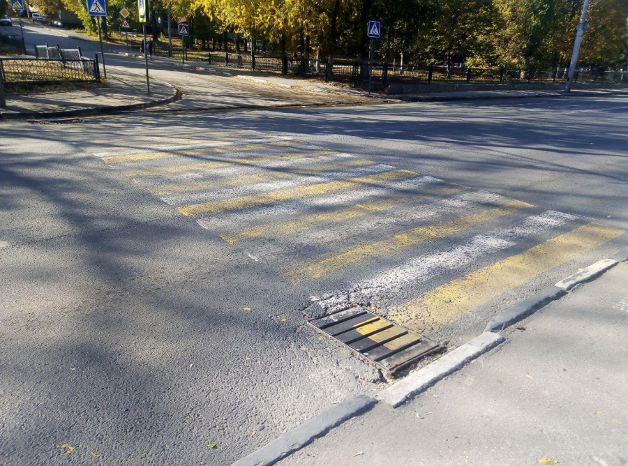 Немногим лучше обстоит ситуация с ливневой канализацией и на противоположной стороне дороги. Начал проседать дождеприемник на пешеходном переходе в районе улицы Рябиновской при движении в сторону Ленинского района.