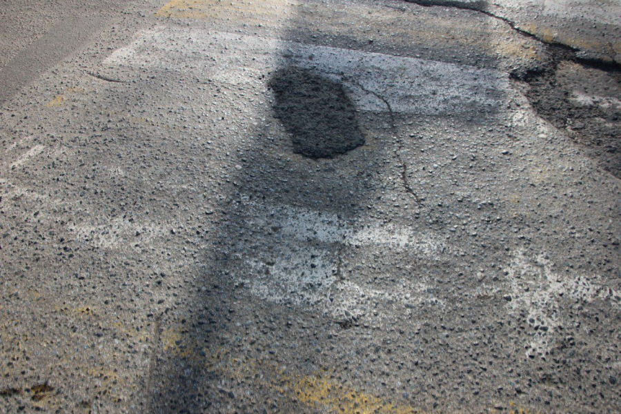 На дорожном покрытии можно заметить следы прежних попыток восстановить ровность дороги и ее безопасность, но латки давно выбились и нуждаются в перекладке, ведь с морозами состояние перекрестка только ухудшится.