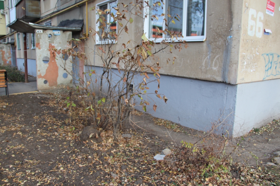 Вопросы вызывает пешеходная дорожка вдоль проезда, с неровным покрытием и местами вышелушивающаяся. О проблемах с водоотведением на Колотилова, 66 свидетельствуют остатки лужи на стыке проезда и парковки, можно только предполагать, каких размеров она достигает после дождя, если через несколько дней после него она остается внушительных размеров. Водоотведение с отремонтированной территории подрядчик попытался осуществить в зеленую зону, оставив зазоры между бортовыми камнями. При этом в ряде случаев уровень зеленый зоны оказывается выше асфальта. В результате вода вместе с землей уходит на территорию двора, затапливая проезды. Такой метод подрядчик - ООО «Садор» - применил на всех отремонтированных территориях. Возможно, именно по этой причине они выглядят так, как будто их не убирали пару лет.