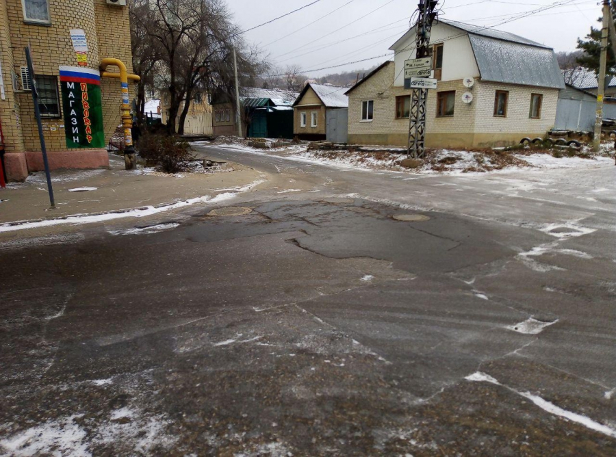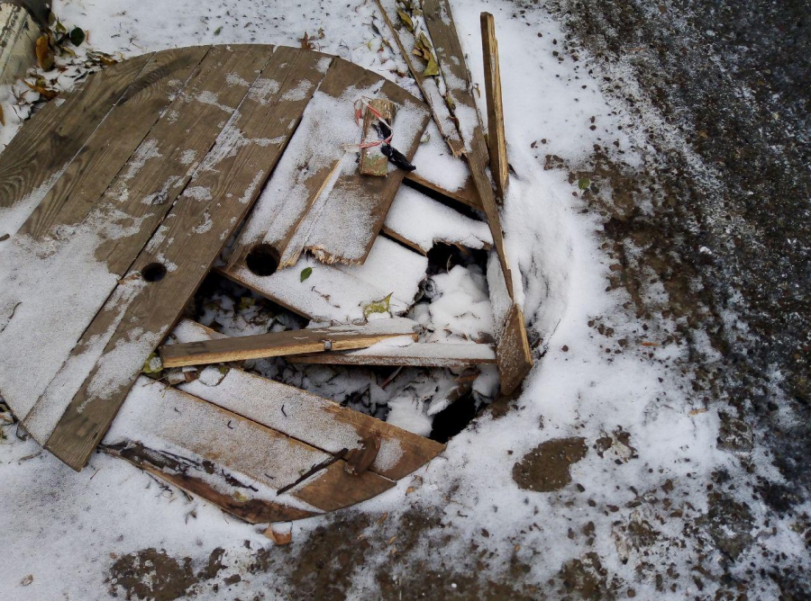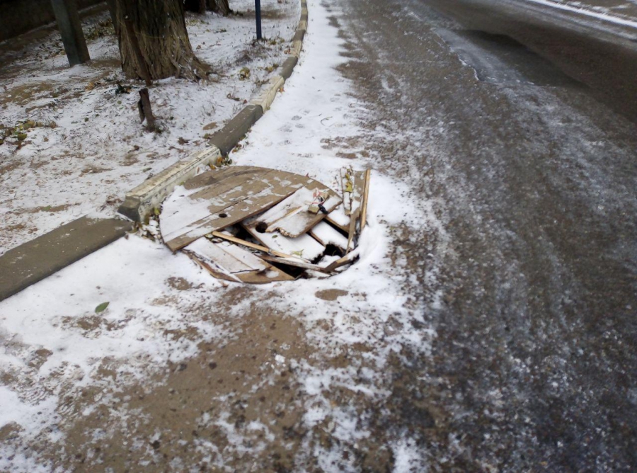 Также на пересечении улиц Чернышевского и Малой Горной находится разрушенный смотровой колодец, прикрытый досками, некоторые из которых уже раздавлены автомобилями.