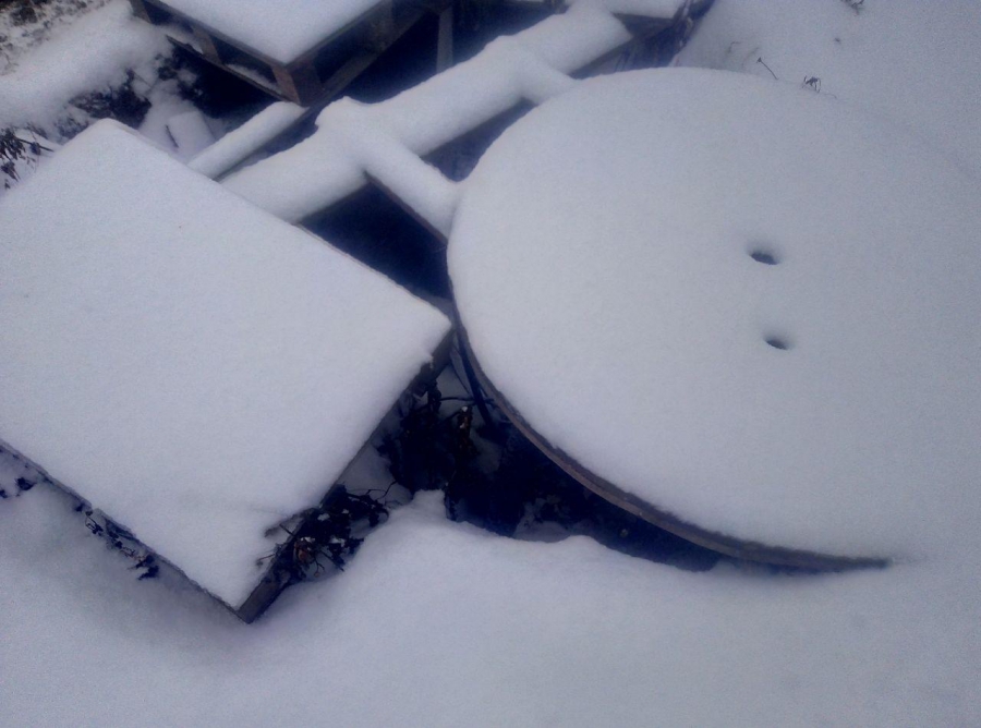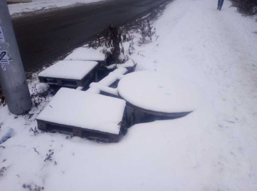 Глубокая яма лишь частично прикрыта досками и палетами, а выпавший снег к тому же еще более скрыл препятствие от глаз пешеходов. Где заканчивается безопасная тропа и начинаются доски, уже трудно различить. Данное ограждение ямы трудно назвать безопасным, так как человек может провалиться, да и сами палеты могут не выдержать дополнительного веса.