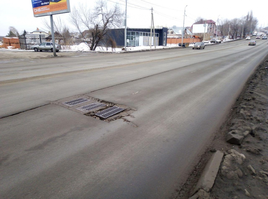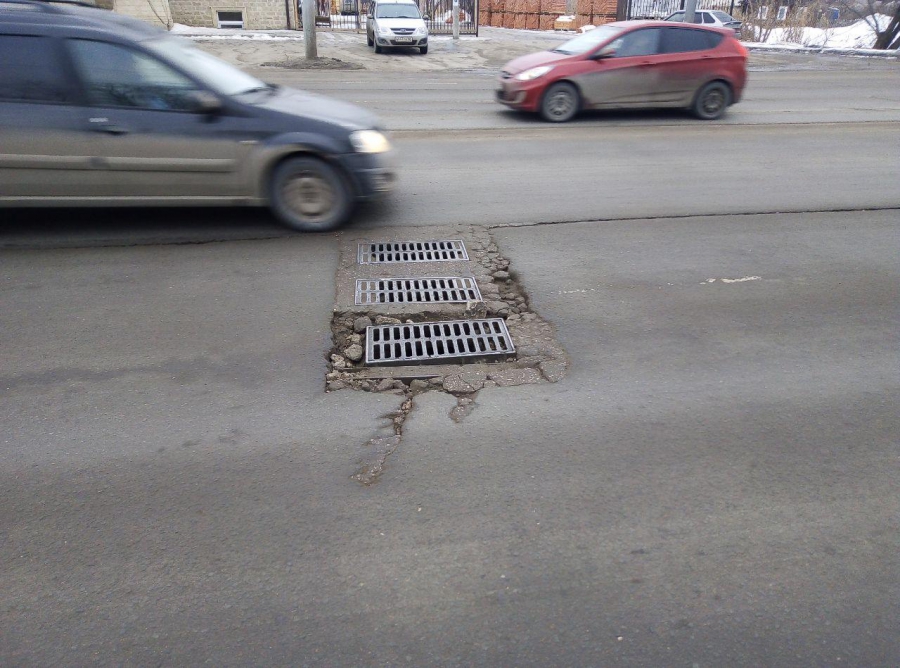 По крам дождеприемника образуется яма на месте раскрошившегося бетона. А водители рискуют пробить колеса об острые края ливневки.