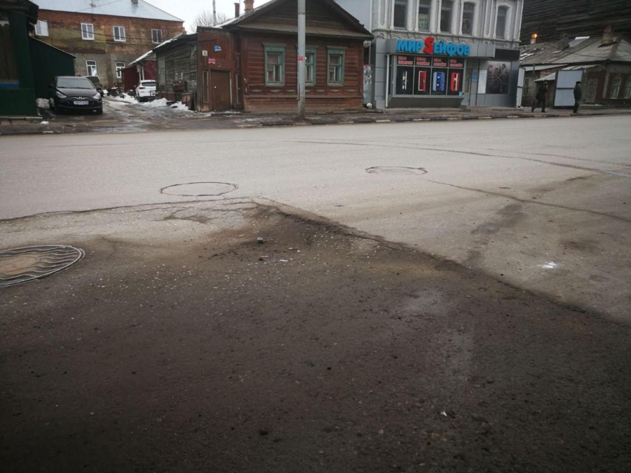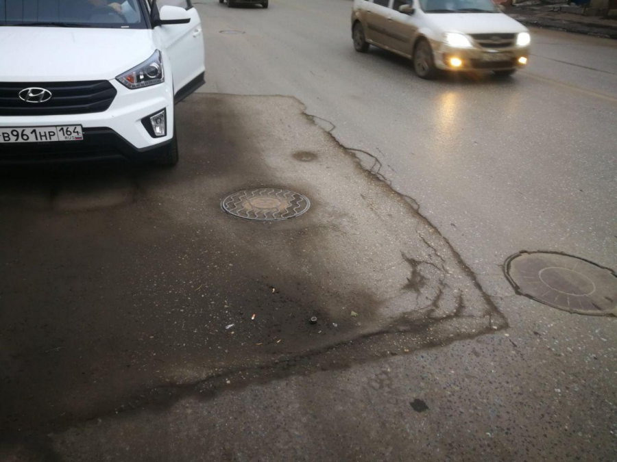 Из-за образовавшейся просадки движение по улице Кутякова в сторону Вольской безопасно только по одной полосе, что приводит к значительным затруднениям на этой загруженной центральной магистрали города Саратова.