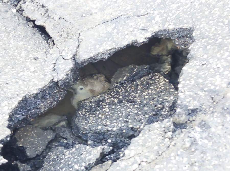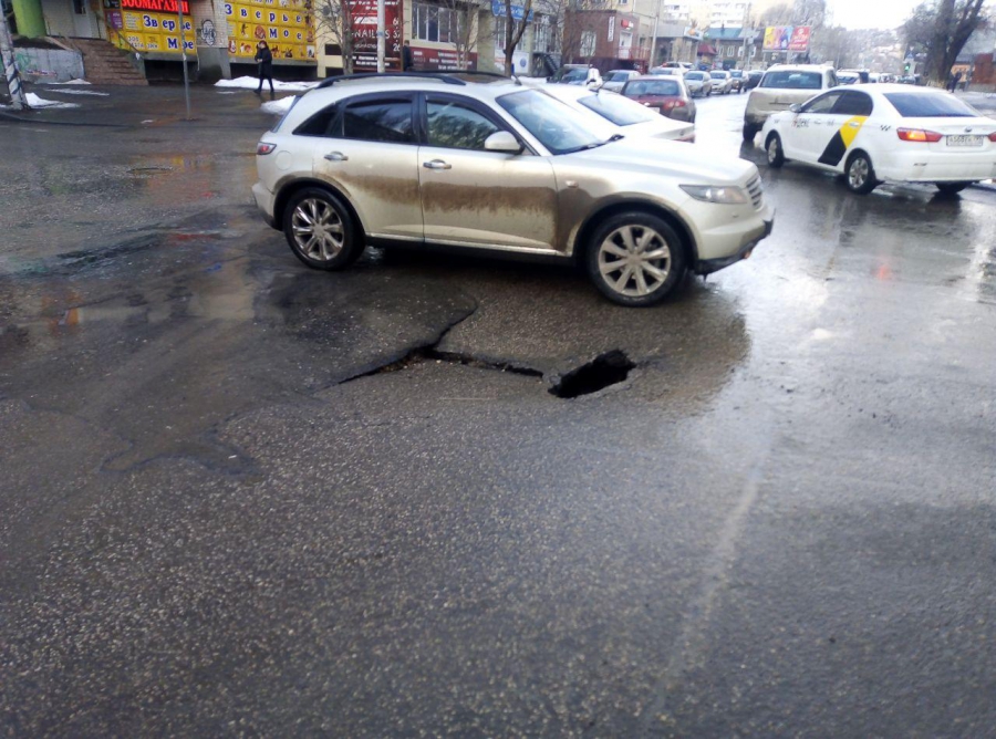 Препятствие никак не обозначено и трудно заметно для водителей, двигающихся по оживленной дороге. Под покрытием наблюдаются пустоты, что позволяет предположить, что разрушения продолжатся. Но уже сейчас в яму может поместиться колесо внедорожники, а разлом по асфальту протянулся более чем на метр.