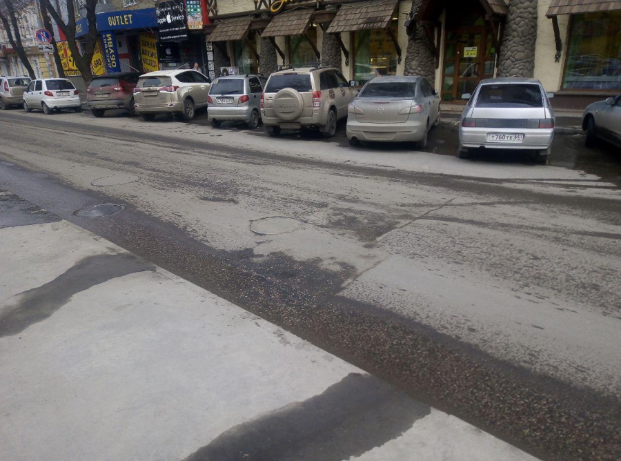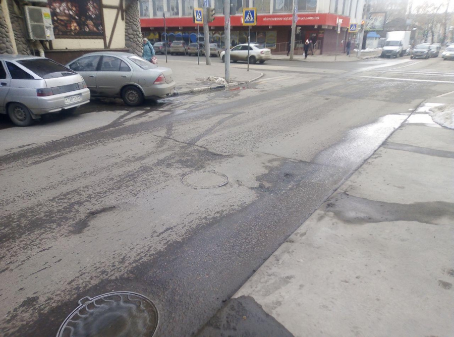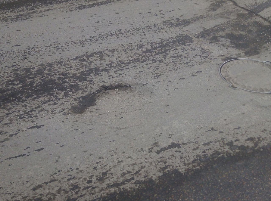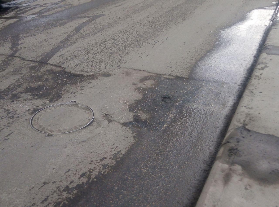 Сквозь разрушающееся покрытие начала проступать заасфальтированная крышка смотрового колоца, который, возможно, и спровоцировал разрушения.