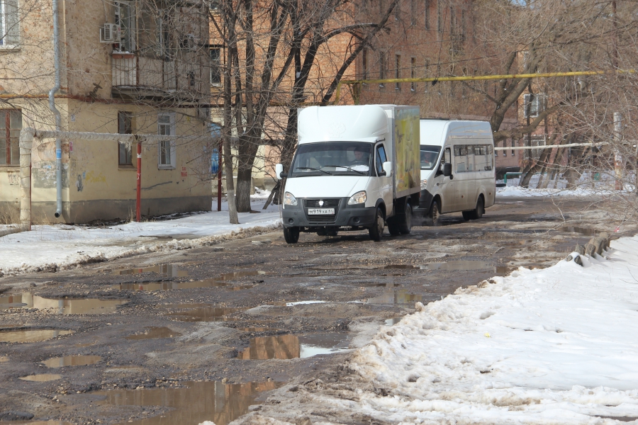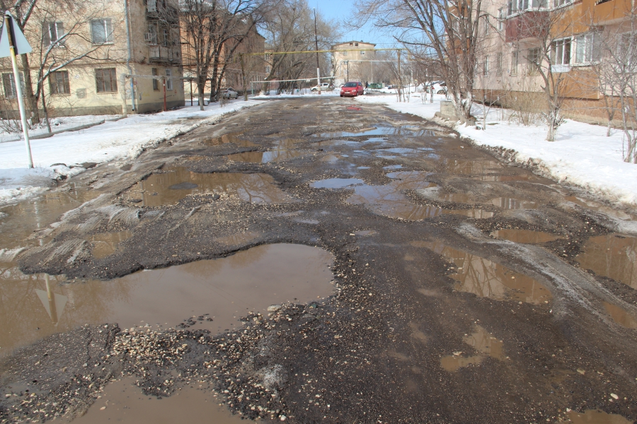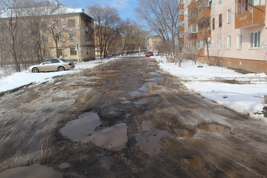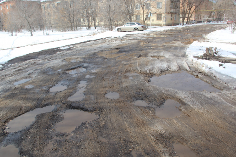 Внутриквартальная дорога вдоль домов №77 и 78 полностью разбита. Многочисленные глубокие выбоины заняли всю ширину проезжей части, из-за чего передвигаться по дороге маршрутным такси и автотранспорту местных жителей приходится на минимальной скорости.