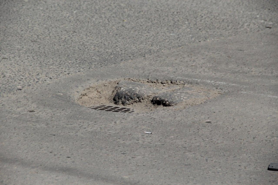 Сквозь дорожное покрытие пытается пробиться смотровой колодец, который был закатан в асфальт. Выбоина расположилась в середине проезжей части, затрудняя движение на этой загруженной центральной улице города.