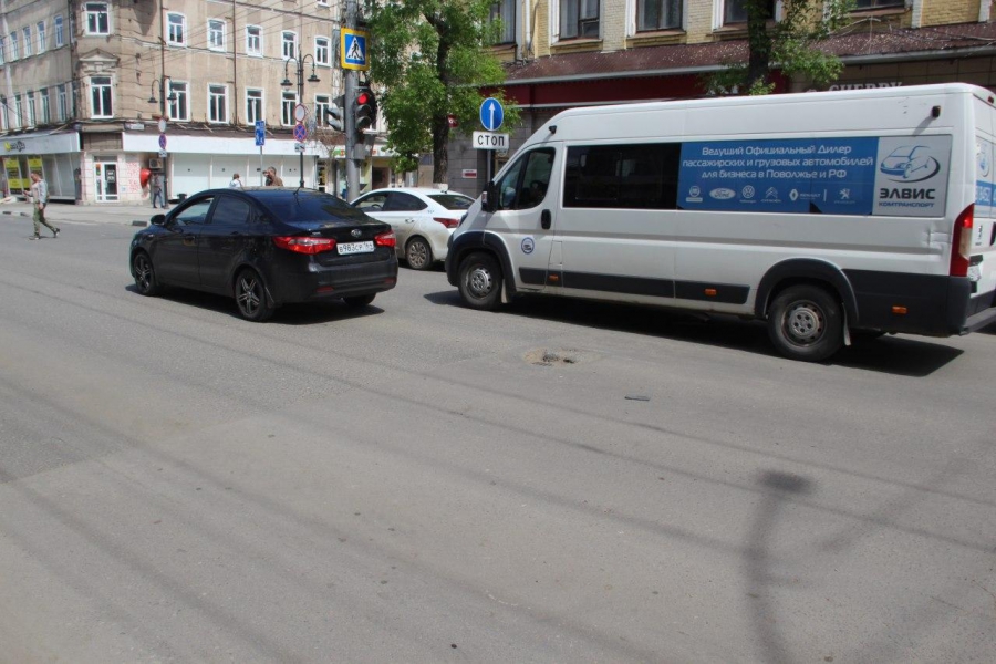 На улице Максима Горького перед пересечением с проспектом Кирова на дороге образовалась яма.