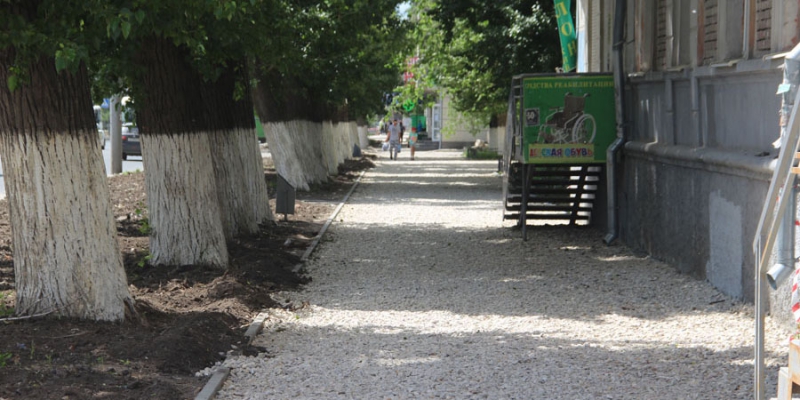 Ремонт пешеходной зоны по четной стороне проспекта начался еще в апреле от улицы Авиастроителей и протянулся до улицы Пензенской, но асфальт появился далеко не на всех участках. Из-за этого местные жители более полутора месяцев ходят по щебню. Вместо того чтобы доделать тротуар, подрядчик перешел на противоположную сторону улицы, где занялся демонтажем и щебнением.