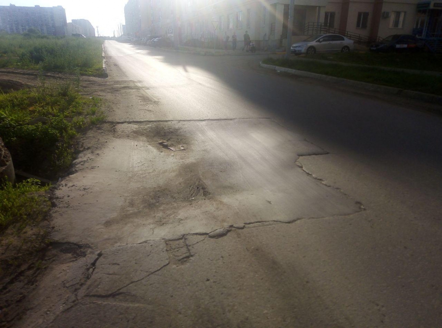 Кроме выбоин, на этой новой улице Саратова движение затрудняет просадка рядом с домом №11, которая заняла полностью одну из полос для движения.