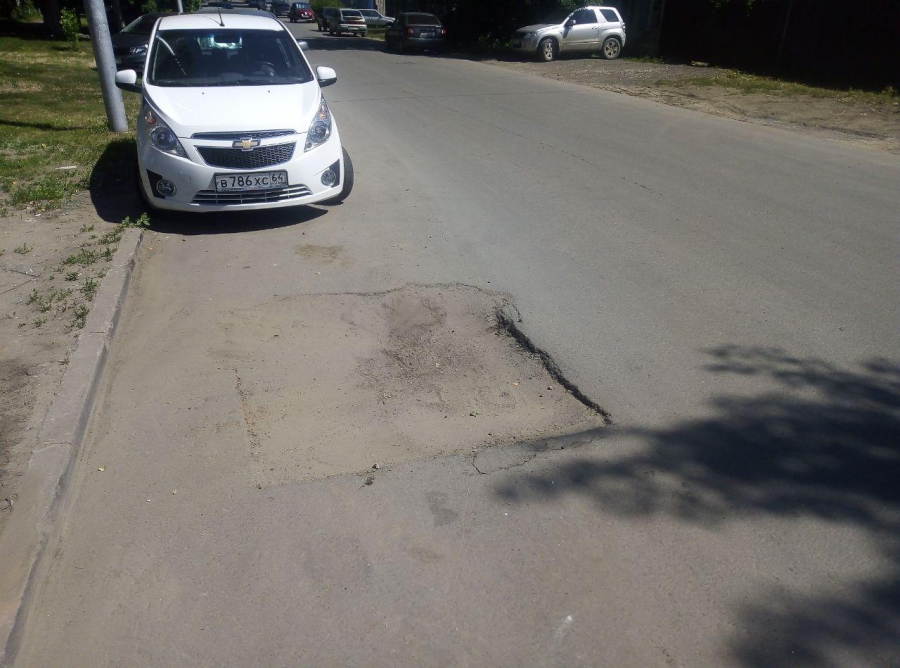Судя по ровным краям ямы, в этом месте проводились вскрышные работы, поэтому разрушается слой восстановленного покрытия. И в скором времени на месте просадки может образоваться провал, но уже сейчас разрушения представляют угрозу для транспорта.