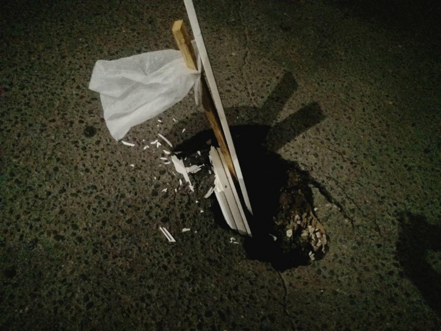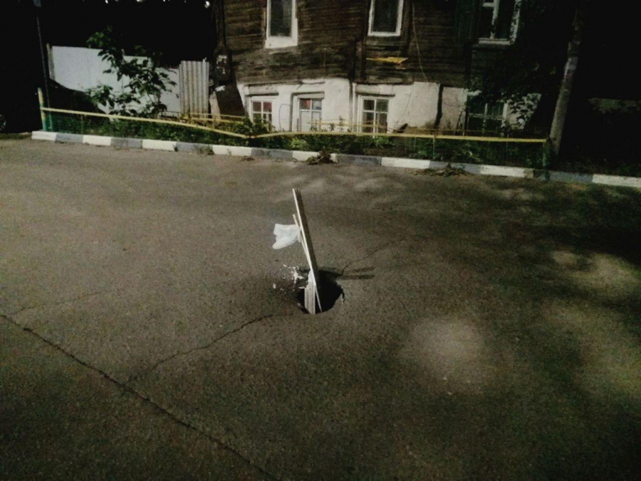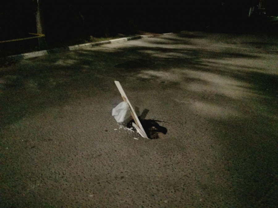 Опасное препятствие обозначили палками и целлофановым пакетом, чтобы хоть как-то предупредить водителей.