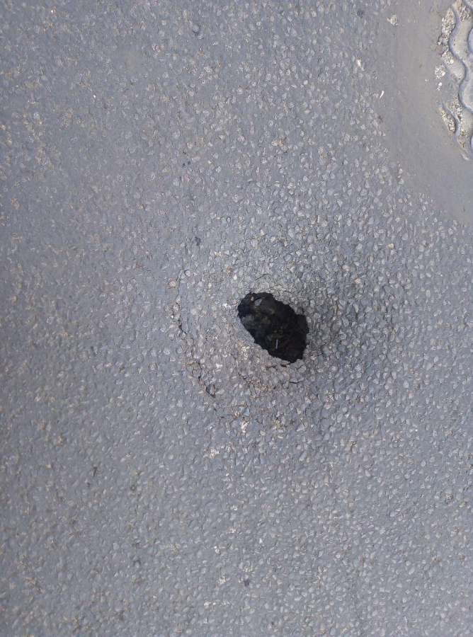 О разрушениях в этом месте «Дорожный контроль» сообщал в начале июля. За прошедший месяц просадка превратилась в провал, а выбоина рядом со смотровым колодцем увеличилась в размерах.