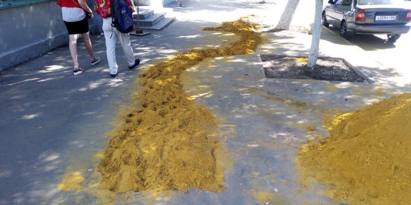 Для восстановления безопасности прохода пешеходов яму отсыпали песком, при том, что при устройстве тротуаров песок не применялся, а в качестве основания использовался щебень. Теперь же виновнику вскрышных работ придется постараться, чтобы восстановить прежнее состояние покрытия согласно требованиям муниципального контракта.