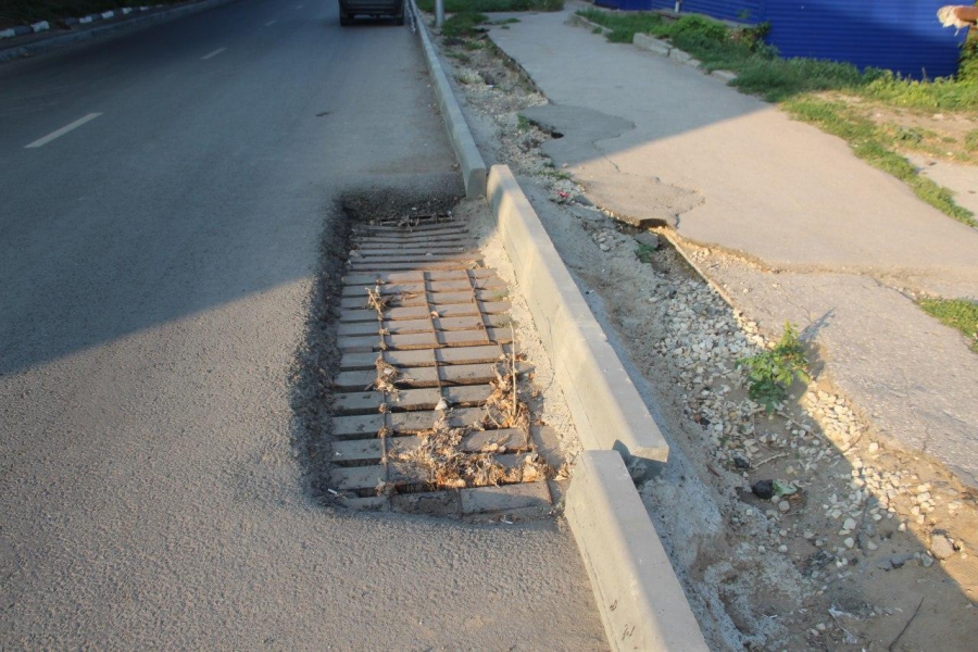 Опасность для автотранспорта на этой небольшой улице представляет и значительно заниженный дождеприемник, который занял крайнюю левую полосу и протянулся на несколько метров.