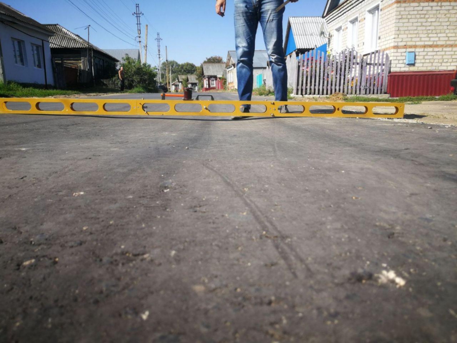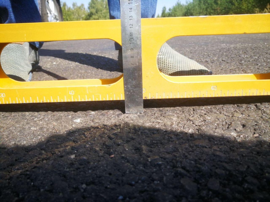 Первым местом визита стала улица Ст. Разина в Балтае. Здесь был уложен верхний слой асфальта. На дороге на себя сразу обратили внимание 3 участка с просадками. На одном из них уже началось разрушение покрытия. При замере просадок 3-метровой дорожной рейкой было установлено, что они достигают глубины от 3 до 3,5 см.