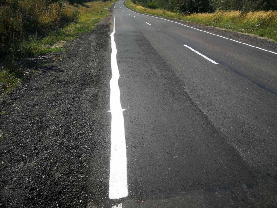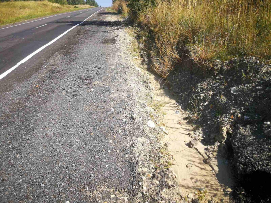 Следующим местом инспекции стал отремонтированный участок региональной дороги между селами Б. Озерки и Журавлиха. Несмотря на то, что дорожные работы проводились здесь совсем недавно, покрытие уже успели местами переложить. Особо досталось участку на подъеме в гору. Со стороны обочины здесь расположилось несколько крупных латок. Очевидно, что в этих местах дорога просела из-за слабого основания. Можно предположить, что так происходит из-за того, что вдоль дороги не устроены железобетонные лотки и отсутствует укрепление бетоном кювета. По этой причине спускающиеся под уклон ливневые массы напитывают основание дороги, делая его непрочным. Учитывая, что сейчас выпадает достаточно мало осадков, а дефекты уже проявились, несложно представить, что весной их будет куда больше. Помимо переделанных участков, при помощи 3-х метровой дорожной рейки были выявлены еще 2 участка с просадками по полосе движения в сторону Журавок. Глубина просадок составляет 2 см. Утверждать, что дорогу изначально приняли с дефектами, мы не можем. Но если они появились вследствие такой непродолжительной эксплуатации, это означает, что совсем скоро глубина их значительно возрастет и асфальт придется перекладывать. Вдобавок к этому по полосе движения в сторону Б. Озерок был обнаружен участок дороги, покрытый выбоинами и требующий незамедлительной реакции.