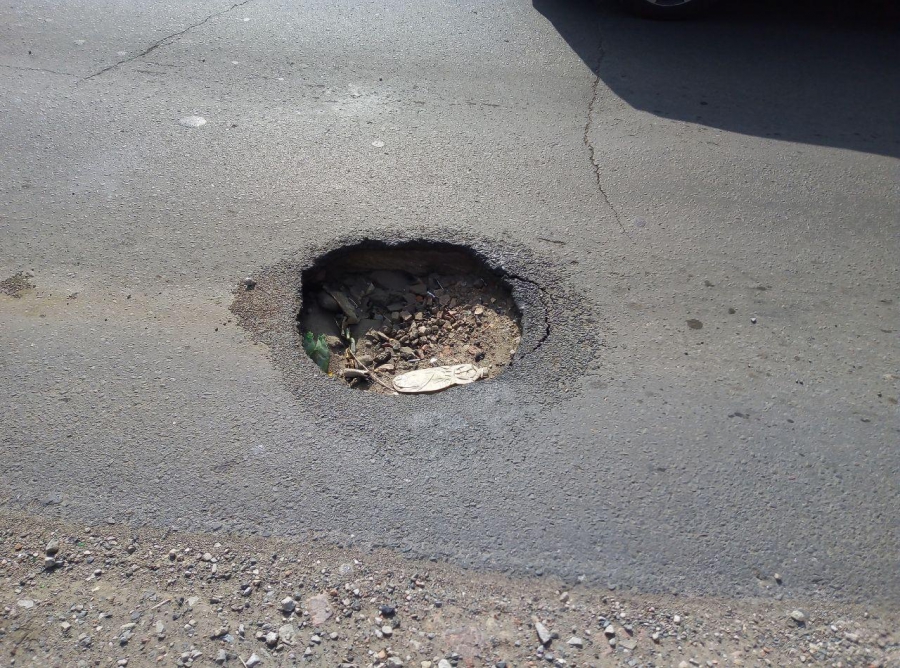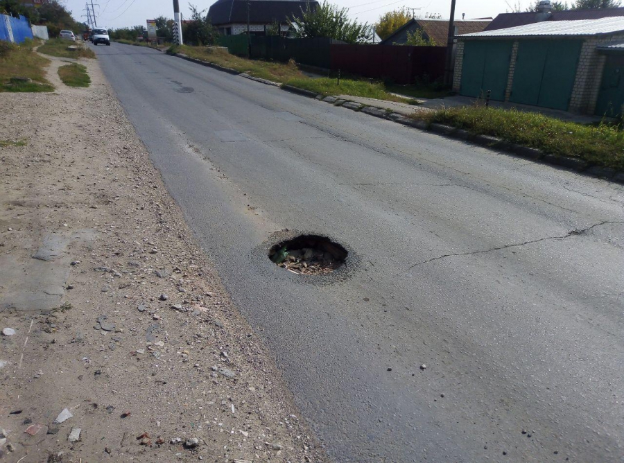Судя по следам по краям ямы, на этом месте была просадка, которую пытались устранить струйно-инъекционным методом. Но такого ремонта хватило ненадолго.