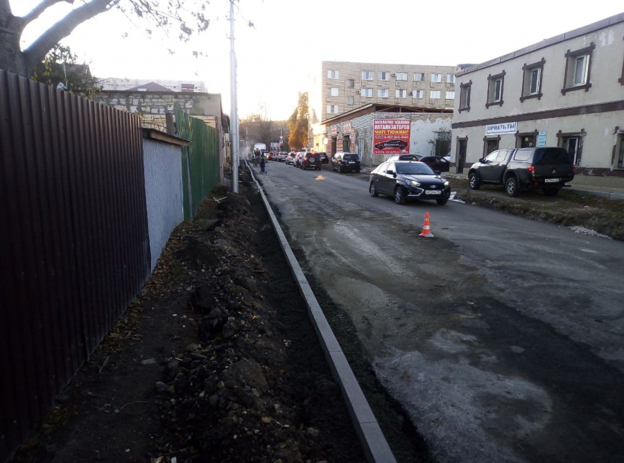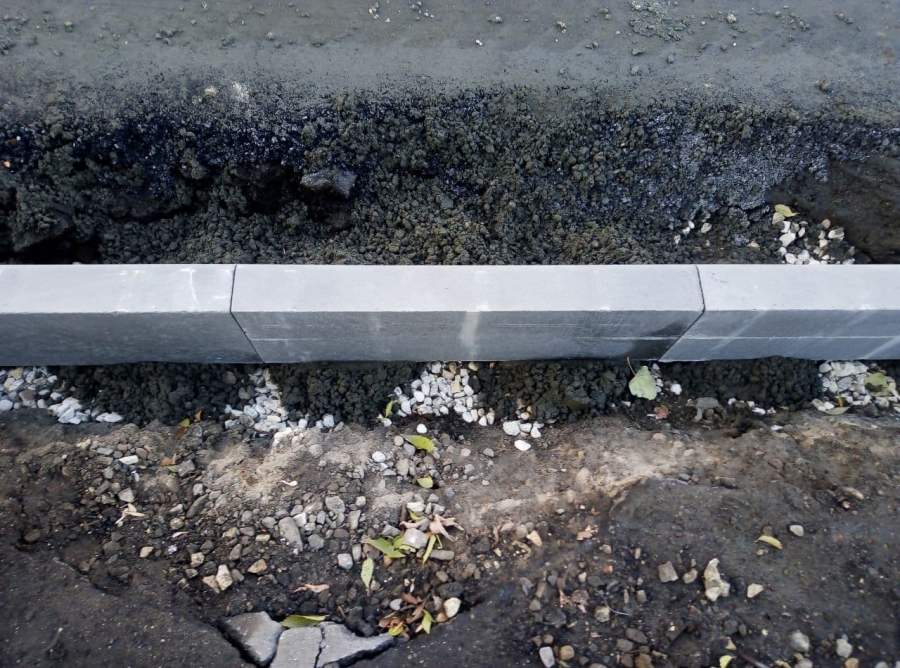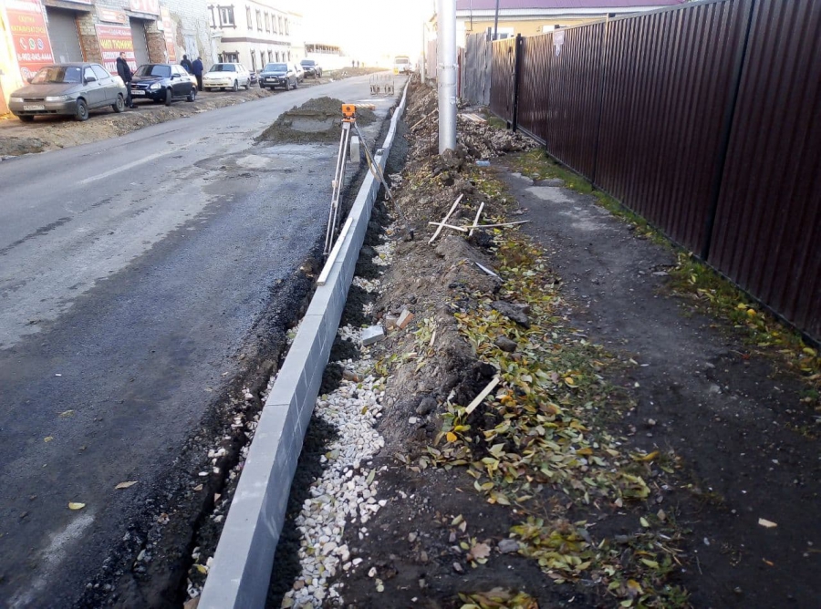 На улице Крайней заканчиваются работы по ремонту дороги. Рабочие устанавливают бортовой камень вместо бетонного основания на маяки, лишь потом укрепляя по краям раствором.