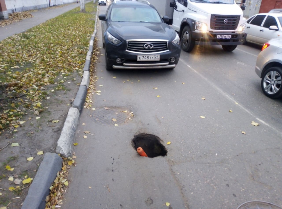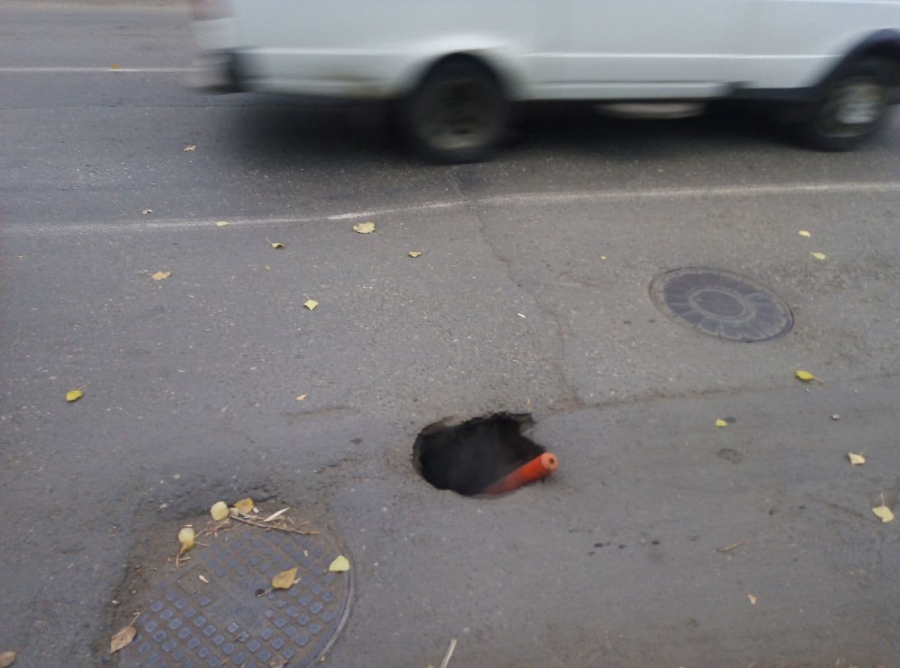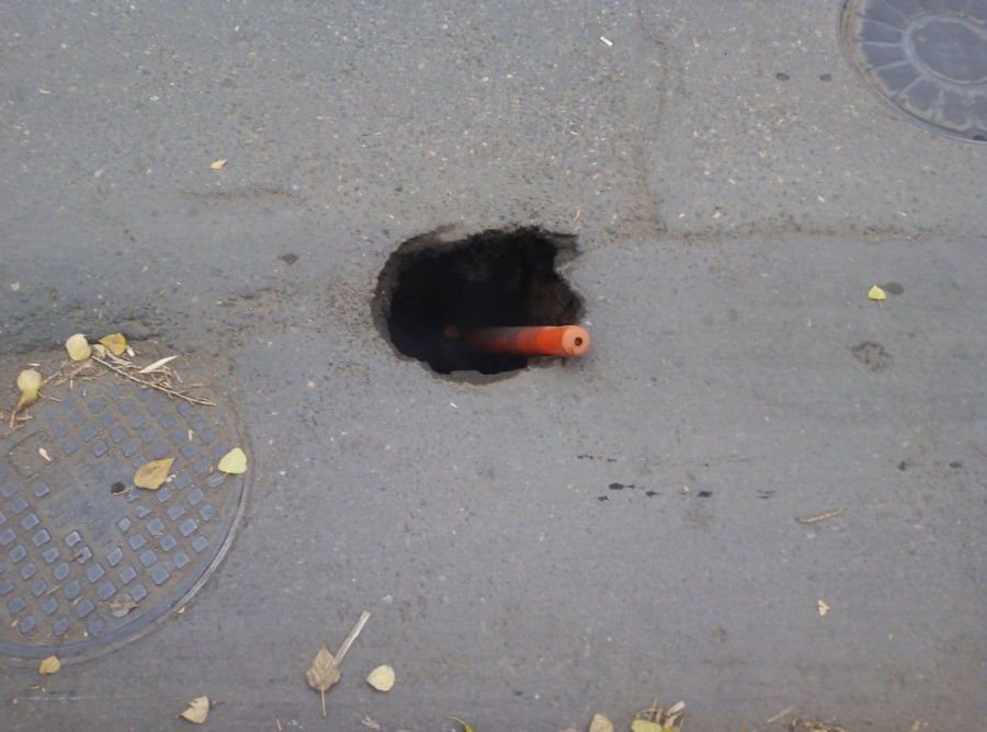 На улице Степана Разина, перед пересечением с улицей Кутякова, образовался провал.