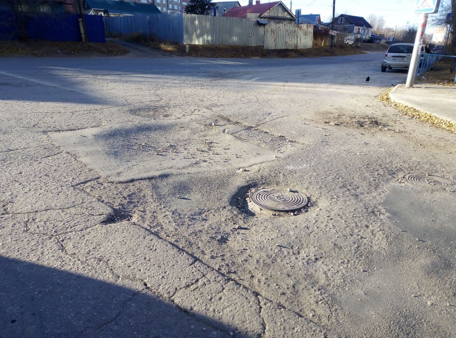 Просадка заняла весь центр дороги, а из-за обилия припаркованного транспорта объехать ее не представляется возможным.