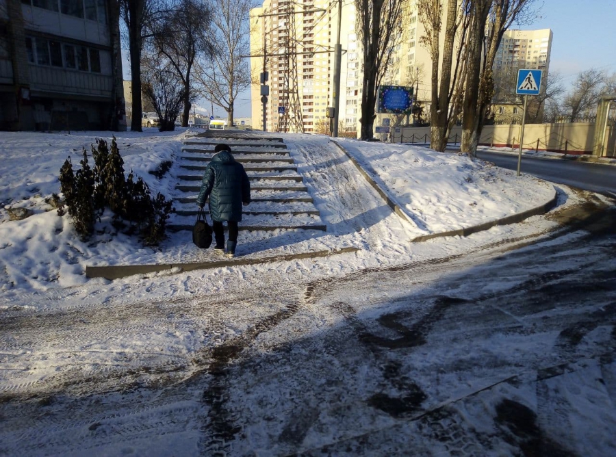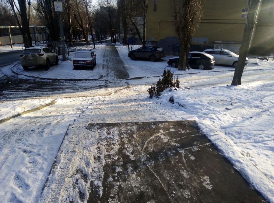 Администрация Ленинского района неоднократно сетовала, что пандус на этом участке сделать невозможно из-за проходящих коммуникаций. В результате местные власти приемлемого решения проблемы найти не смогли, и ограничились формальным присутствием пандуса, который на зиму превращается в ледяную горку.