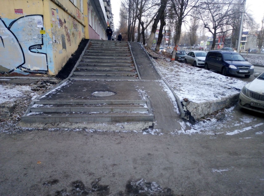Жители проспекта Строителей просят устроить перила на крутом пандусе