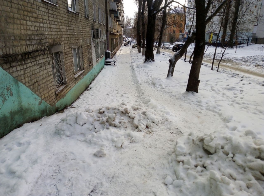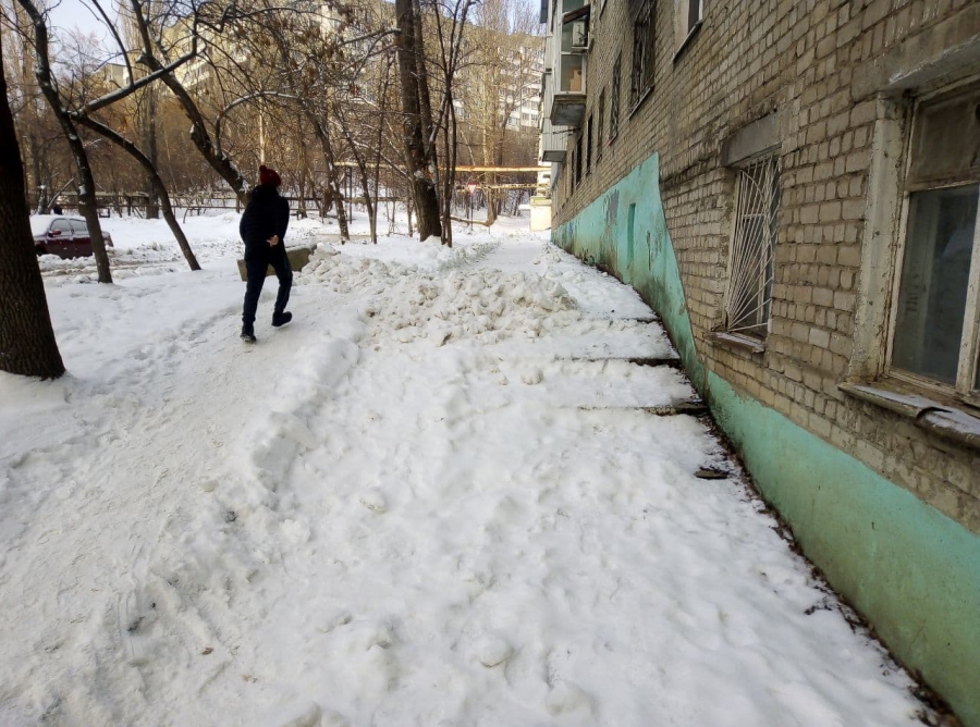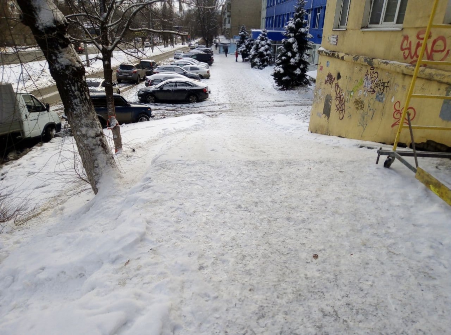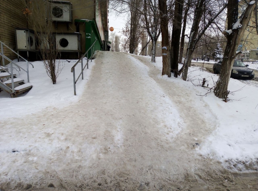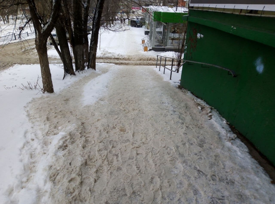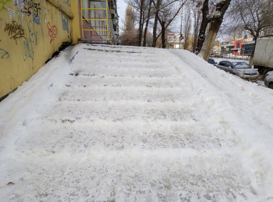 В Ленинском районе от снега очистили лишь ровные участки тротуара, не озабоитившись даже удалением наледи с пешеходных зон или посыпкой их песком. Но наибольшие затруднения пешеходы испытывают на участках, где располагаются лестницы и пандусы. В этих местах очистка вовсе не производилась. На улице Ламповой, на подходах к детской поликлиннике №5, и вовсе на лестницу сгрудили снег с очищенных участков тротуара. Пройти в этом месте с коляской стало невозможно.