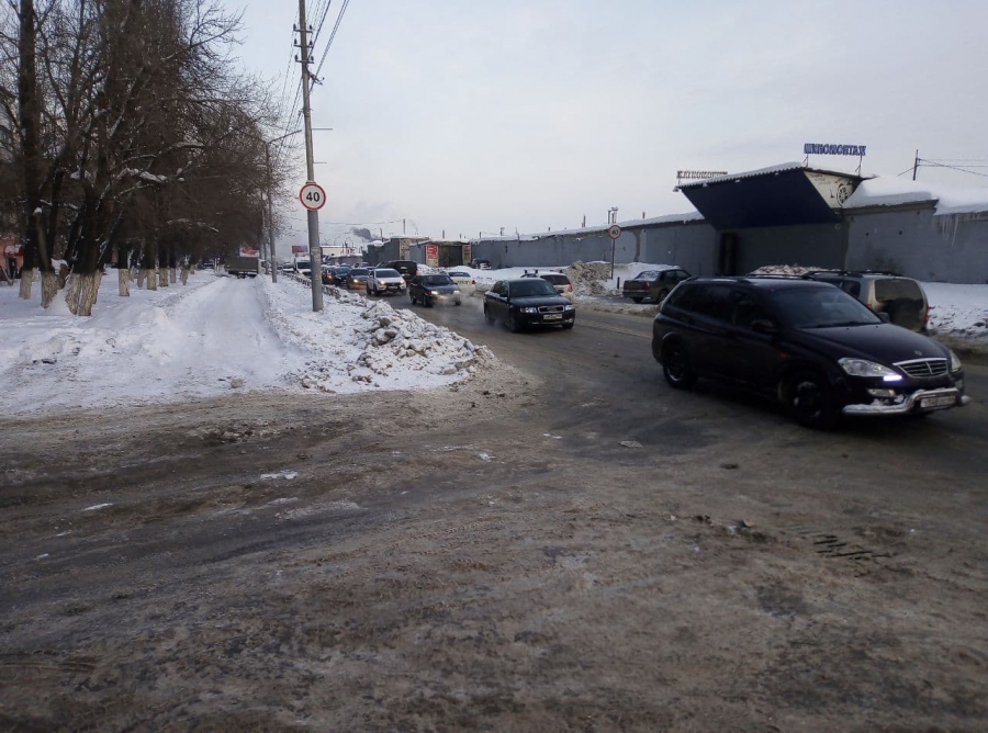 Крайняя правая полоса Ново-Астраханского шоссе в Заводском районе Саратова занята неубранным снегом и льдом, заставляя автомобили, двигающиеся из центра города, ехать в один ряд.