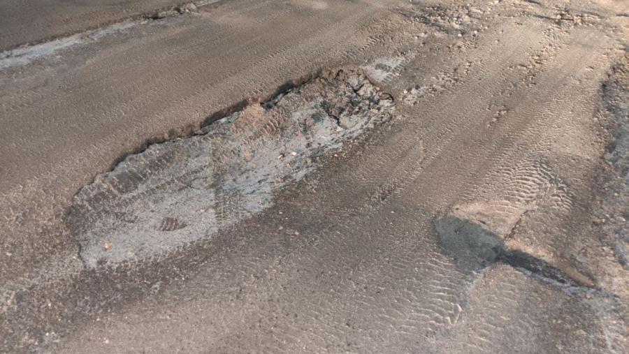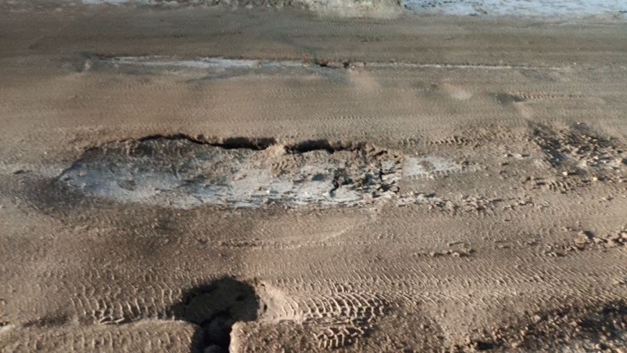 Разрушения появились на участке с восстановленным покрытием, которое начало проседать, а в центре латки асфальт уже провалился.