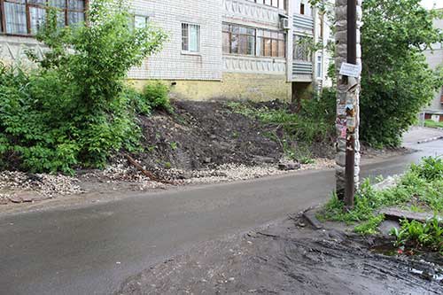 Стоит отметить, что дом 158/164, находится на возвышенности. Поэтому вопрос не только в восстановлении дорожного полотна, где уже по печальной саратовской традиции яму просто засыпали щебенкой, бросив бордюрный камень посреди дороги, но и в безопасности самого строения после снятия слоя земли рядом с фундаментом.