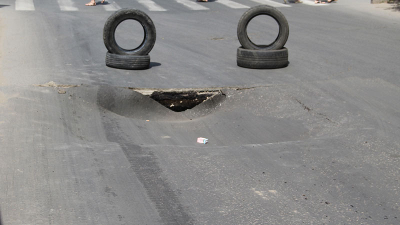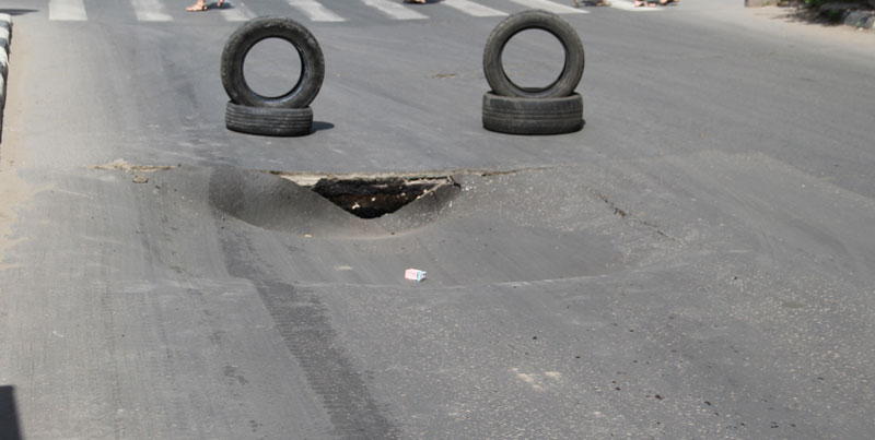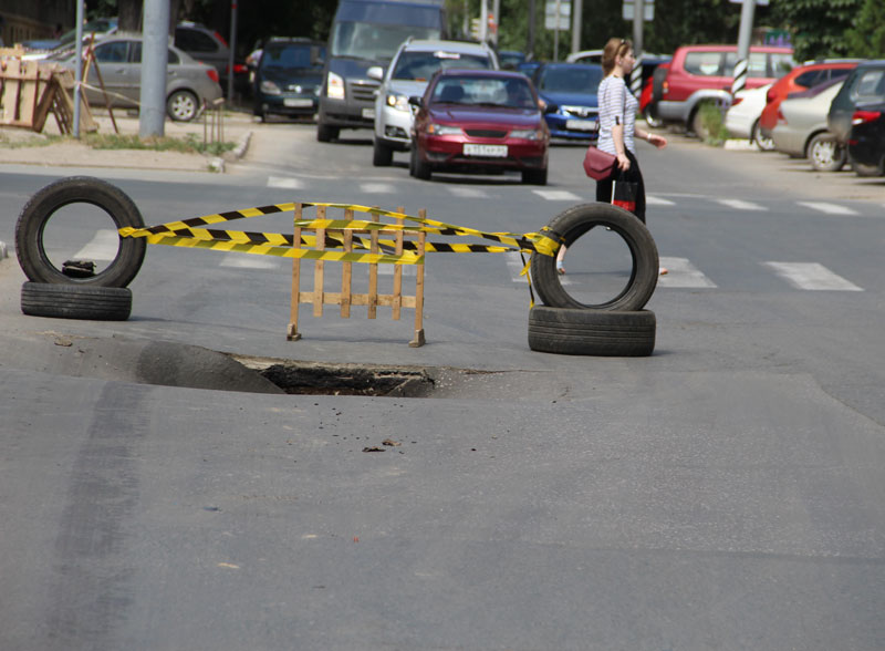 Под жарким летнем cолнцем, перегреваются не только люди и автомобили, но «тает» и асфальт. Глубокий провал образовался на улице Степана Разина, в районе пересечения с Московской в сторону Б. Казачьей. Сотрудники расположенного рядом шиномонтажа, обозначили его покрышками, К моменту приезда «Дорожного контроля» на место прибыл сотрудник дорожной службы для ограждения опасного участка, перекрывшего фактически половину дорожного полотна. Один из рабочих попытался изменрить глубину ямы лопатой, но у него это не вышло, т.к. черенок полностью ушел в провал.
