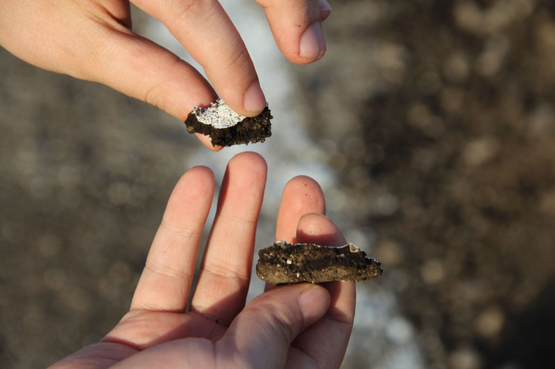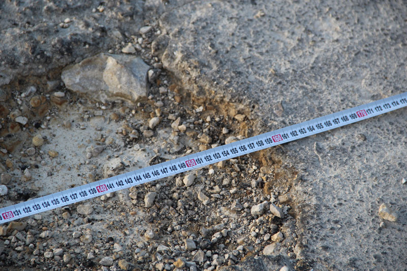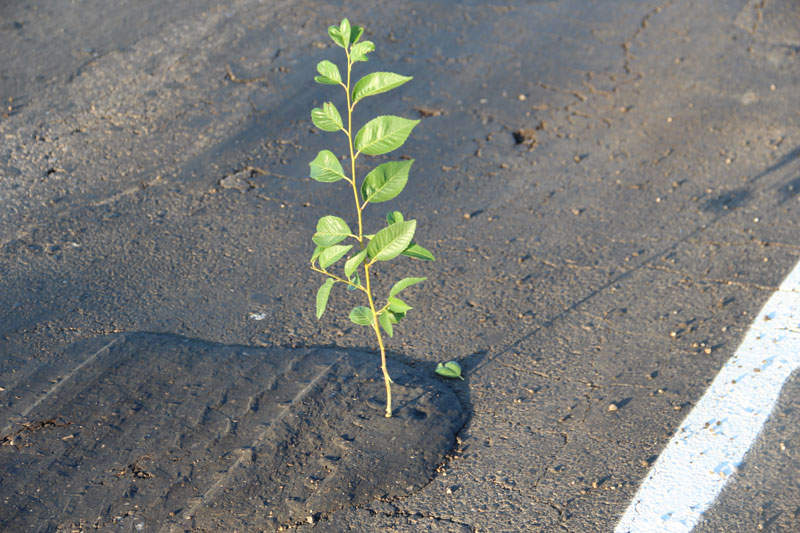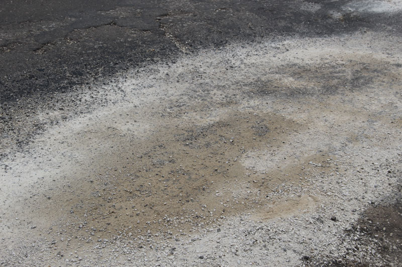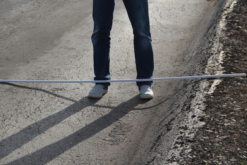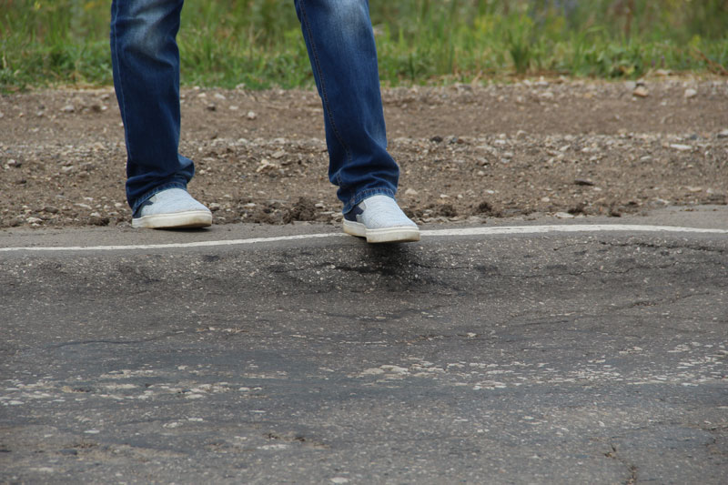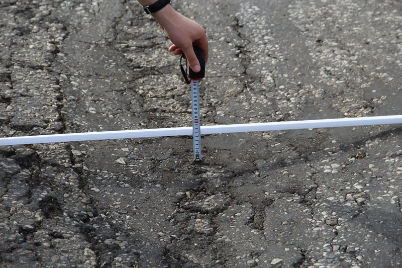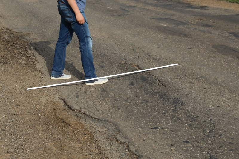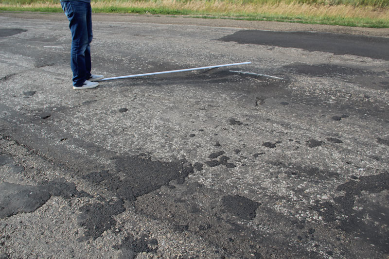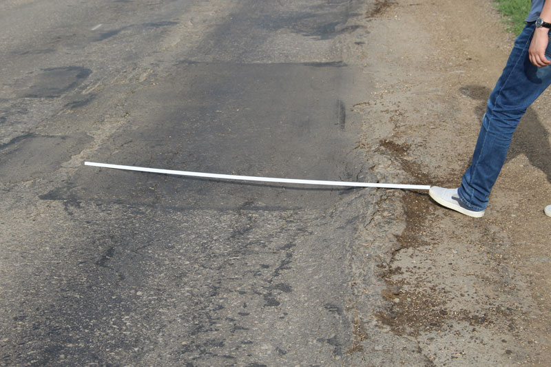 При этом дорожное полотно не было приведено в нормативное состояние, рабочие не срезали неровность, «волну», и положили асфальт прямо на нее. Получилось, что на свежем полотне остались старые провалы. Совершенно бессмысленный ремонт, проведенный, по всей видимости, в обход правил и норм. Здесь же, наступив на соседнюю латку, неожиданно стала проваливаться нога. Латка оказалась настолько мягкой, что не составило труда продавить ее кулаком. После этого стало понятно, откуда берутся гигантские наплывы по кромке дороги, сопровождающие весь Дергачевский район. Автомобили просто выдавливают латки с дороги, как пластелин, создавая волну и колею. В свежую латку без особых усилий удалось воткнуть даже ветку кустарника.