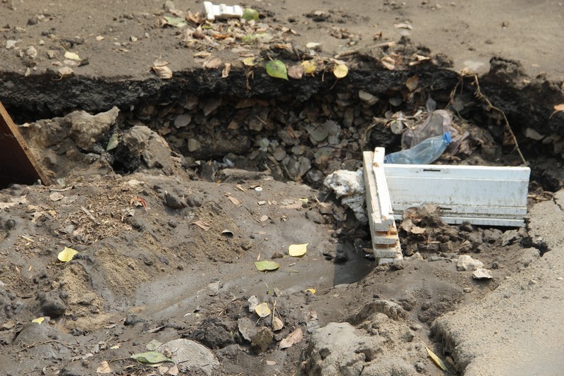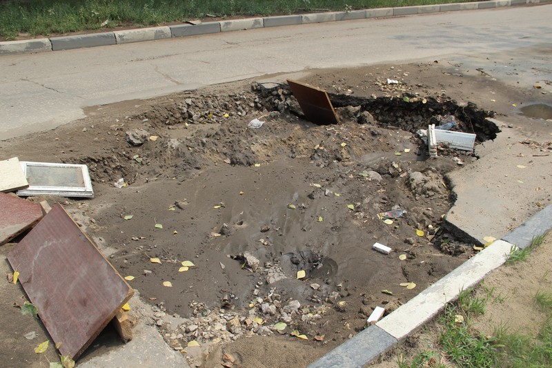У дома №77 ситуация схожая, результат раскопок закидали остатками мебели, соорудив рукотворный трамплин, возможно, из расчета, что машины должны перепрыгивать препятствие.