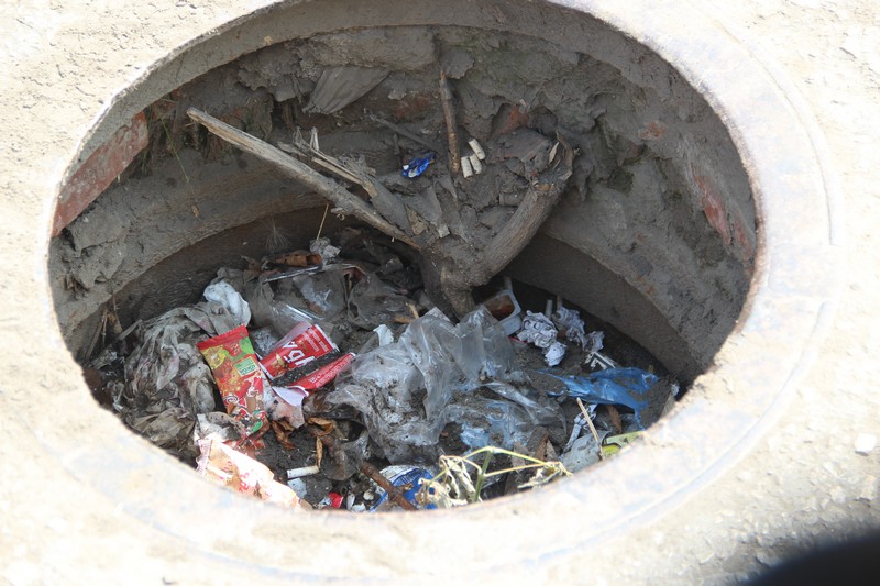 Ближе к дому 11а находятся очередные вдавленные люки, а у входа в магазин крышка колодца вообще отсутствует, превратив его в мусоросборник.
