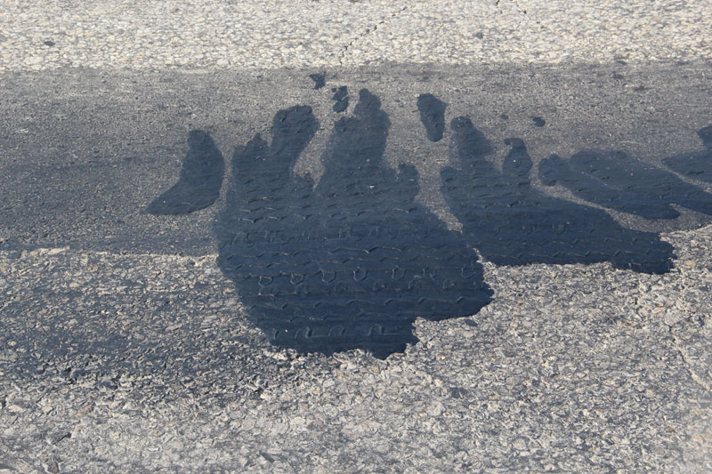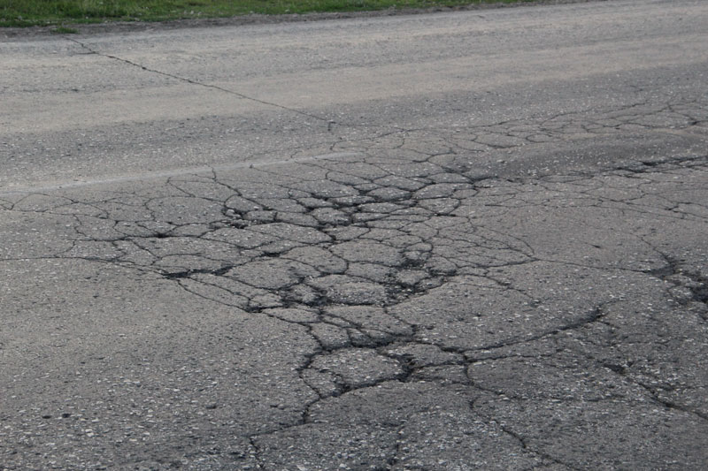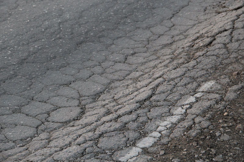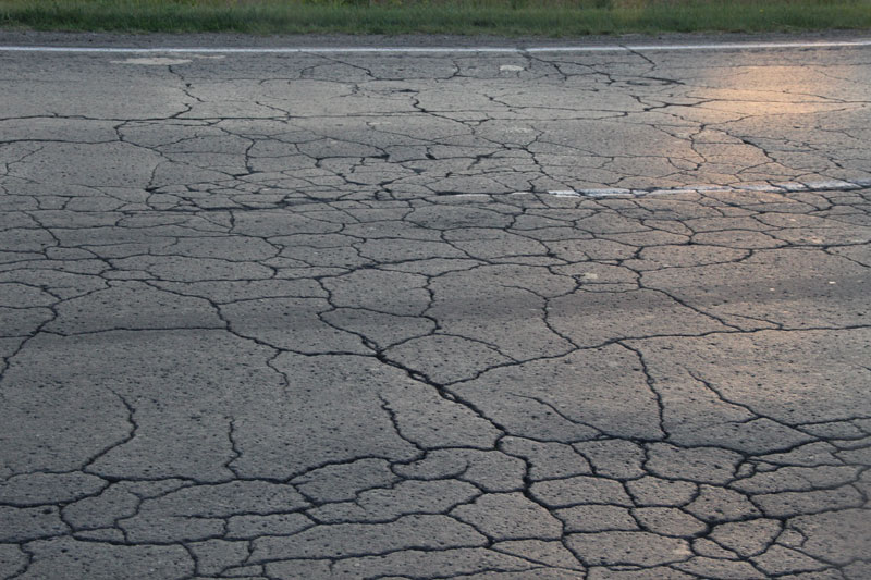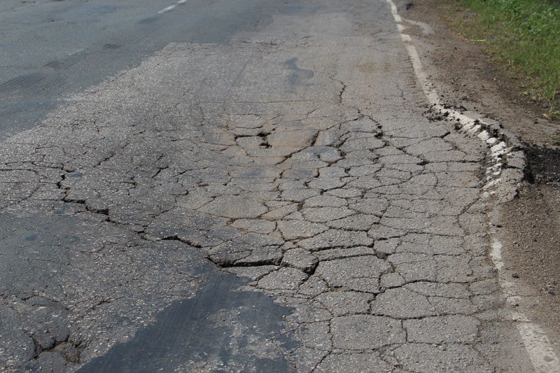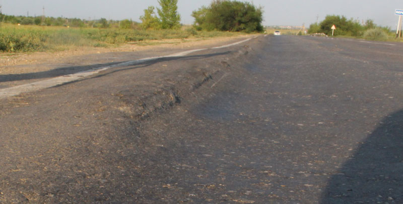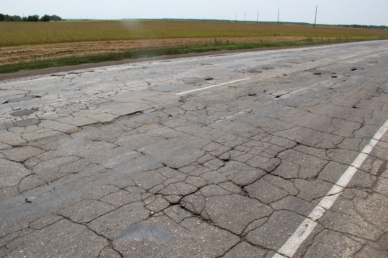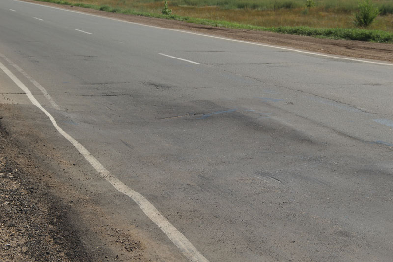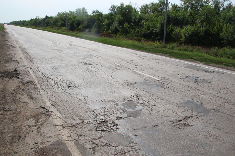 Сетки трещин столь живописны, что им бы позавидовал любой художник-абстракционист. Жаль только, что свидетельствуют они о полном разрушении полотна, и единственным способом борьбы за живучесть подобных отрезков является нанесение сверху защитного слоя асфальта. Колеи местами превышают 10 сантиметров, на обочинах дорога рассыпается в пух и прах, асфальт порою выдавливается из дороги, как начинка из пирожка.
