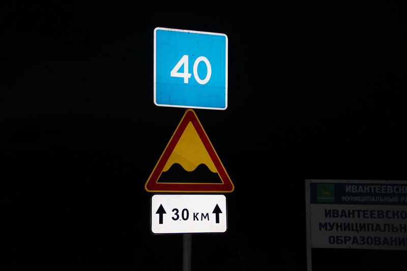 Ивантеевский район приветствует автолюбителей честно и не обещает им хорошей жизни. Сразу после стелы района установлены дорожные знаки, указывающие на неровную дорогу и советующие продолжать движение по трассе со скоростью 40 км/ч. Подобные предупреждения встречаются по всему Ивантеевскому участку.