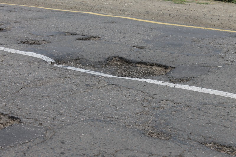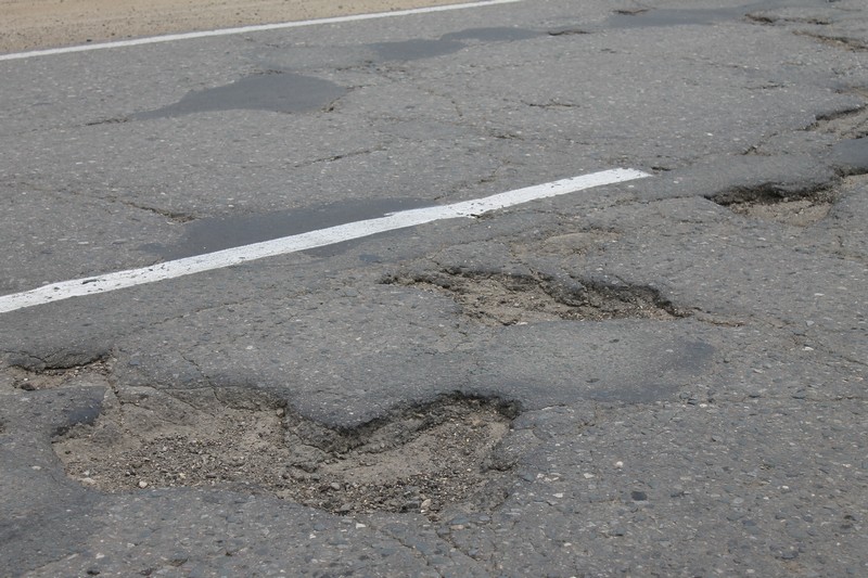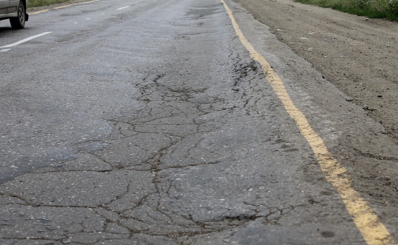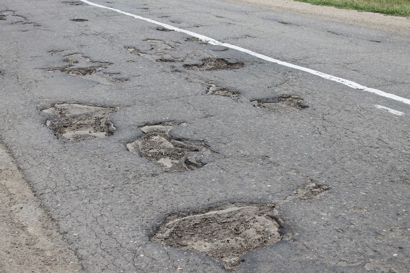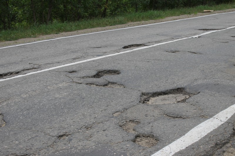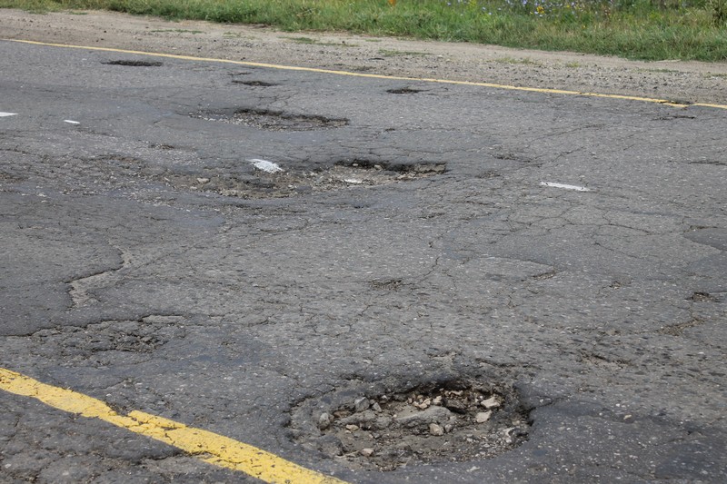 Дорога от Соколового поселка поднимает вопрос: большую площадь дороги занимают выбоины или остатки асфальта? Яркий пример того, как выглядит нарушение пункта 3.1.1 ГОСТа Р 50597-93, не допускающего повреждения более 2.5 квадратных метров дорожного полотна на 1000 метрах покрытия. При этом многие из ям стараются перекрыть предельно допустимые размеры отдельных выбоин по ширине, длине и глубине, указанных в пункте 3.1.2 того же ГОСТа