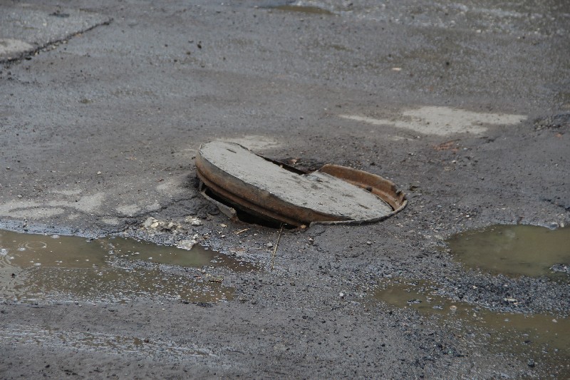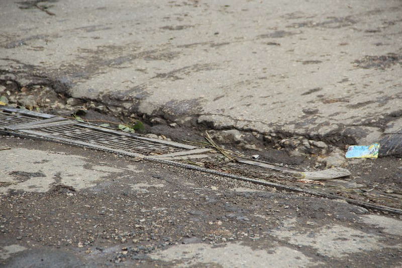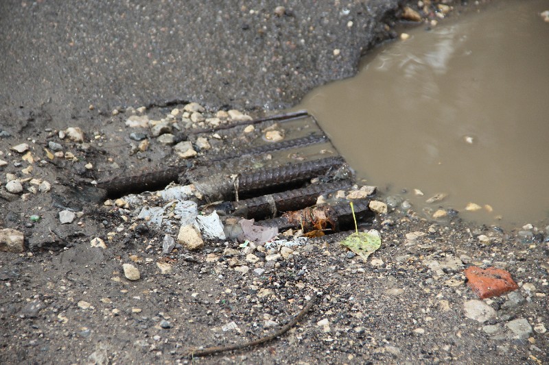 Начинается улица Осенняя огромной решеткой ливневки поперек дороги перед пересечением с проспектом Строителей. Она была основательно забита и при этом глубоко продавлена, с разрушением прилегающего дорожного полотна.