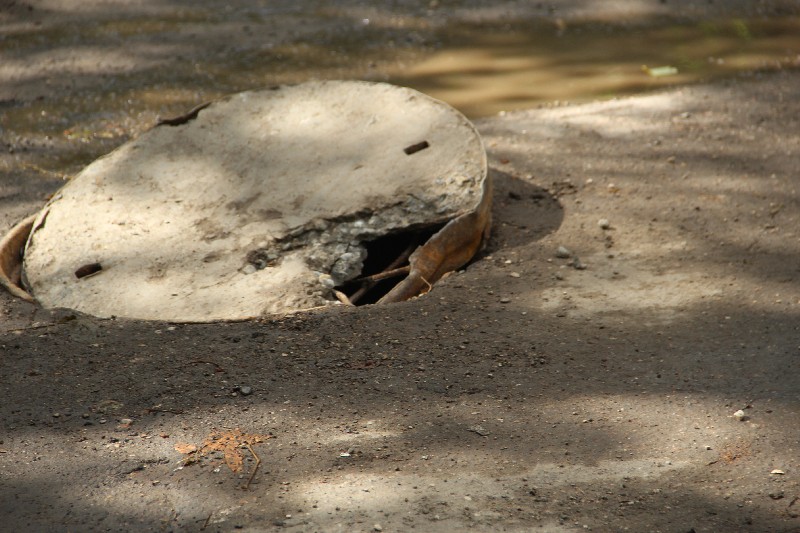 Небольшая по своей протяженности улица Осенняя заканчивается пересечением с Ламповой. Где на самом перекрестке расположился полуоткрытый люк с вывернутой и разбитой крышкой.