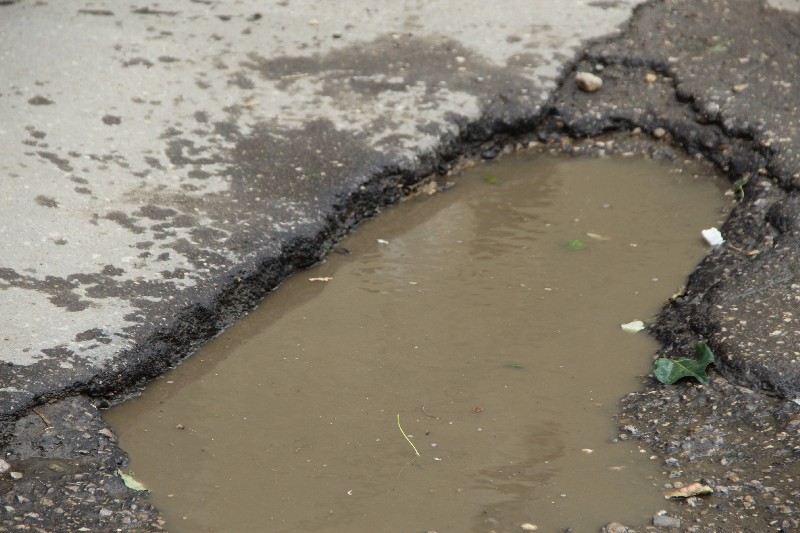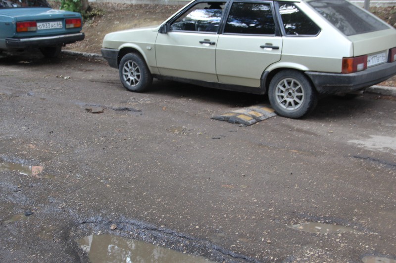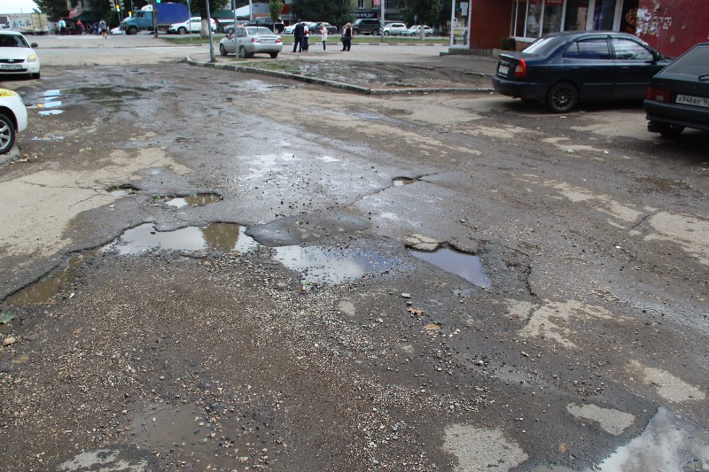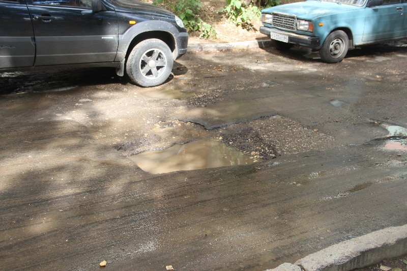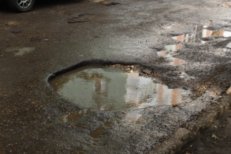 Россыпь ям на любой вкус, чью глубину не смогли скрыть лужи, расположилась в окрестностях дома №4, въезд во двор которого встречает автолюбителей большой выбоиной.